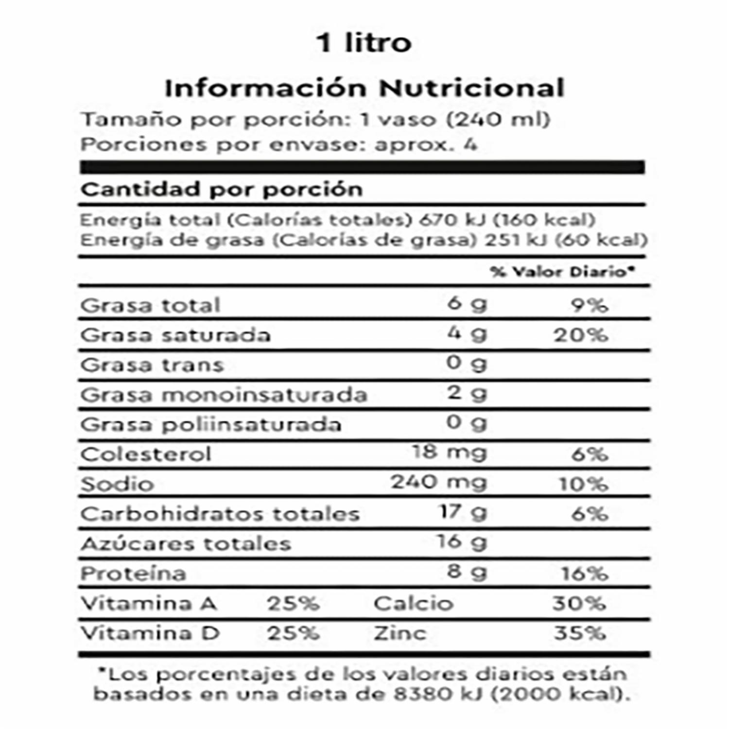 - Leche semidescremada, azúcar, cacao en polvo, estabilizadores (polifosfato sódico, ortofosfato sódico, trifosfato sódico, difosfato sódico y carragenina), saborizantes idénticos al natural de chocolate, regulador de acidez (bicarbonato de sodio), sulfato de Zinc, edulcorante (sucralosa), enzima lactasa, conservante (nisina), vitaminas A y D.