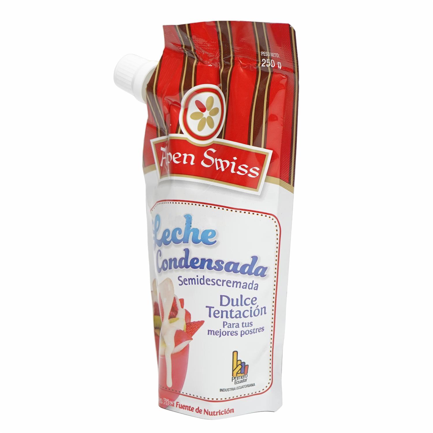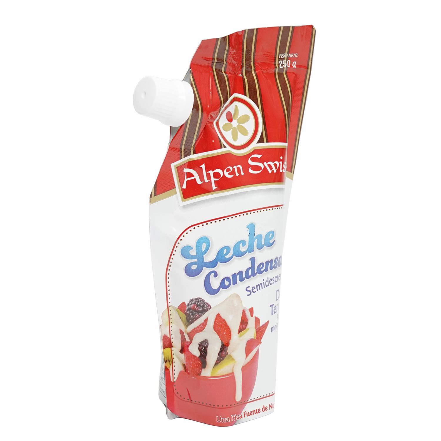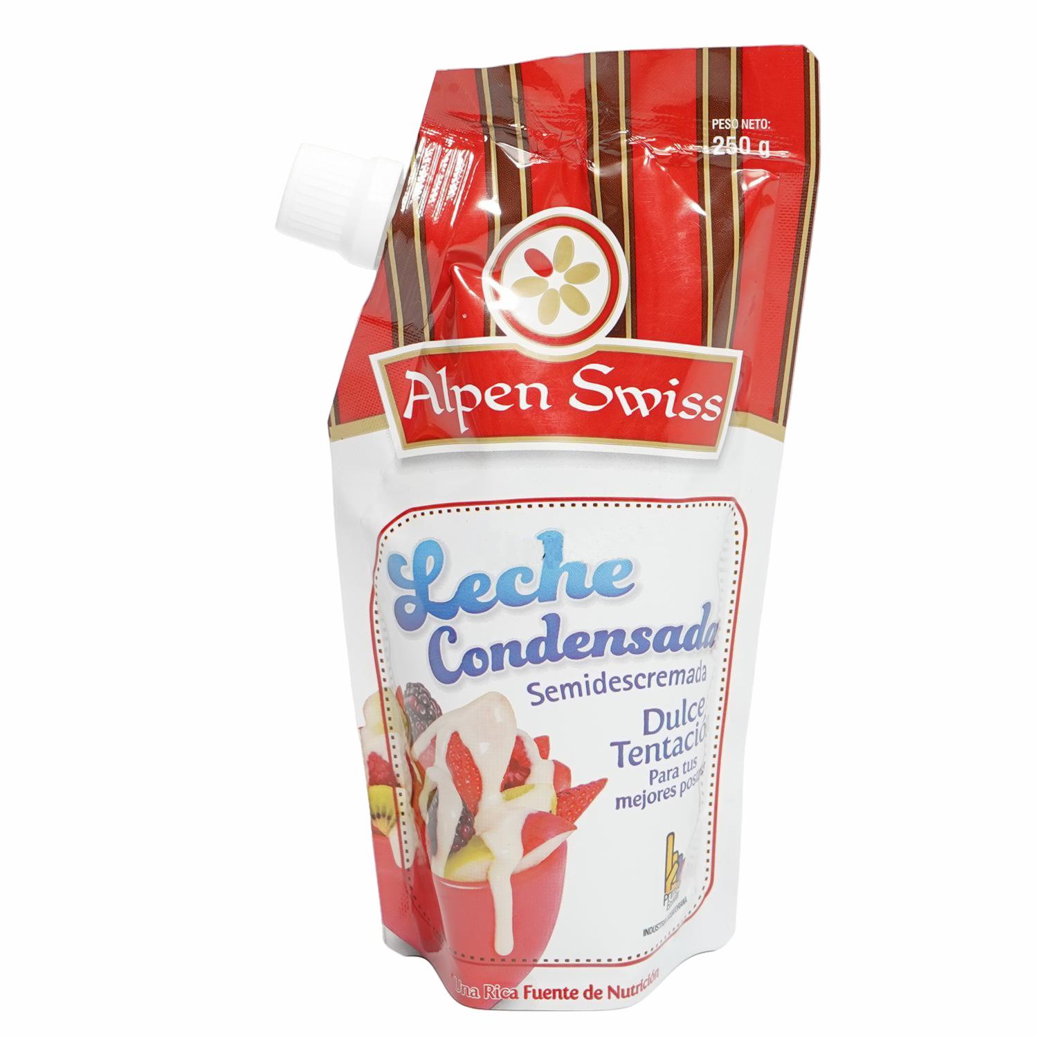 - Disfruta de la riqueza y dulzura de la Leche Condensada Semidescremada de ALPEN SWISS en su presentación de 250 g. Esta leche condensada es perfecta para agregar un toque cremoso y delicioso a tus postres, café, té y otras preparaciones culinarias
