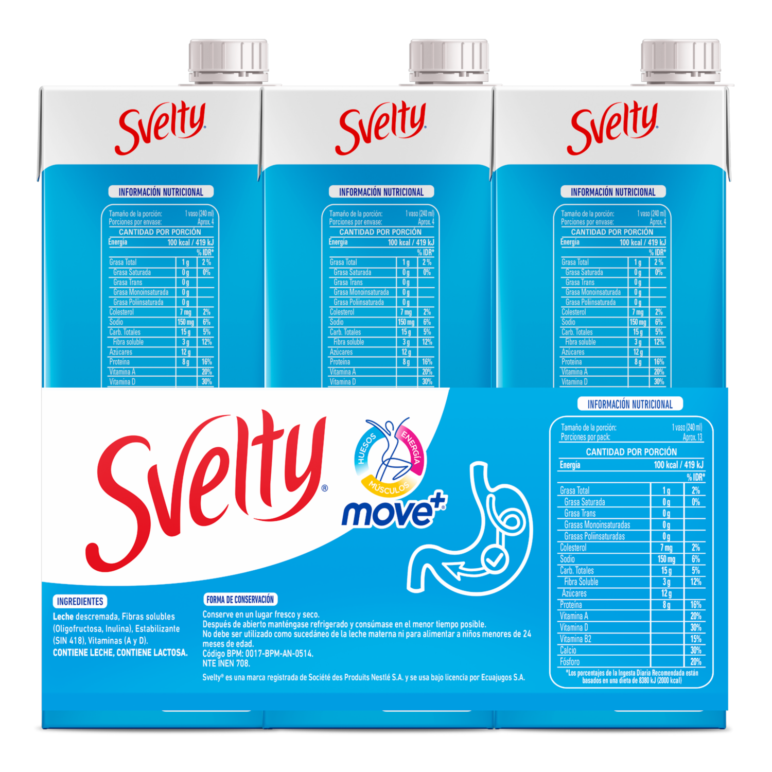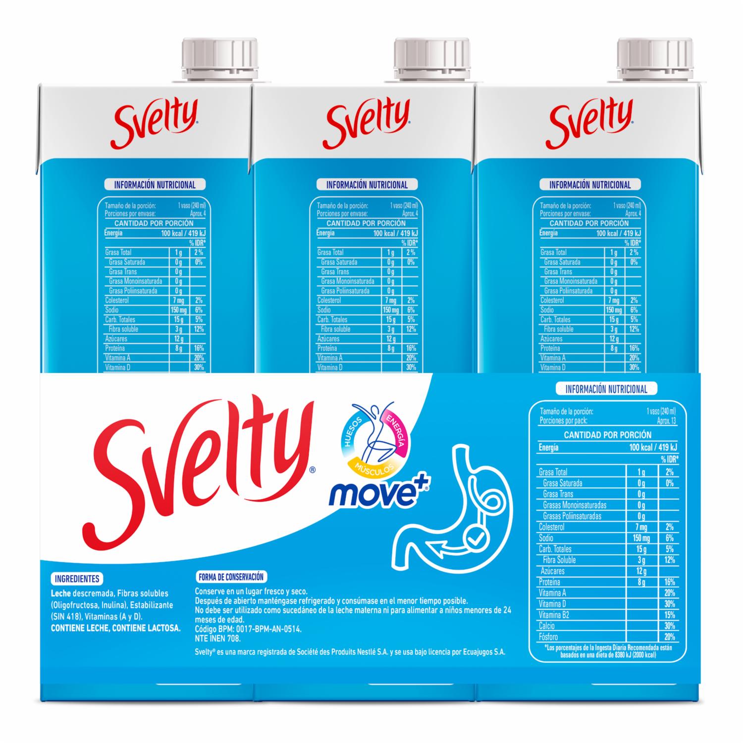 Leche SVELTY® un producto de Nestlé diseñado para darle a tu cuerpo importantes VITAMINAS, MINERALES. Además, contiene PROTEÍNA de alta calidad para mantenerte activo a lo largo del día. Contiene la NUEVA fórmula MOVE+ (mezcla especial de nutrientes que contribuyen a HUESOS FUERTES, MÚSCULOS SALUDABLES, y ENERGÍA OPTIMA)