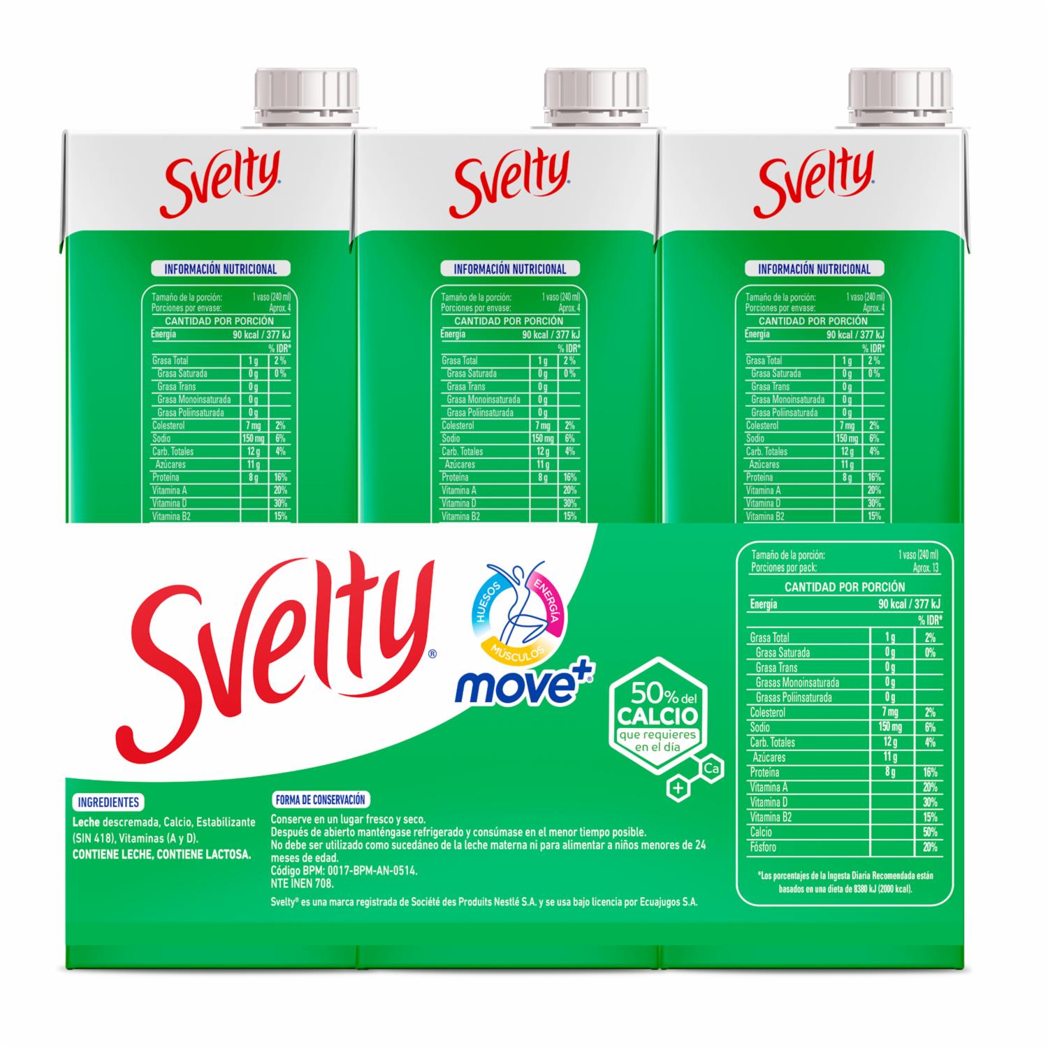 Leche SVELTY® un producto de Nestlé diseñado para darle a tu cuerpo importantes VITAMINAS, MINERALES. Además, contiene PROTEÍNA de alta calidad para mantenerte activo a lo largo del día. Contiene la NUEVA fórmula MOVE+ (mezcla especial de nutrientes que contribuyen a HUESOS FUERTES, MÚSCULOS SALUDABLES, y ENERGÍA OPTIMA)