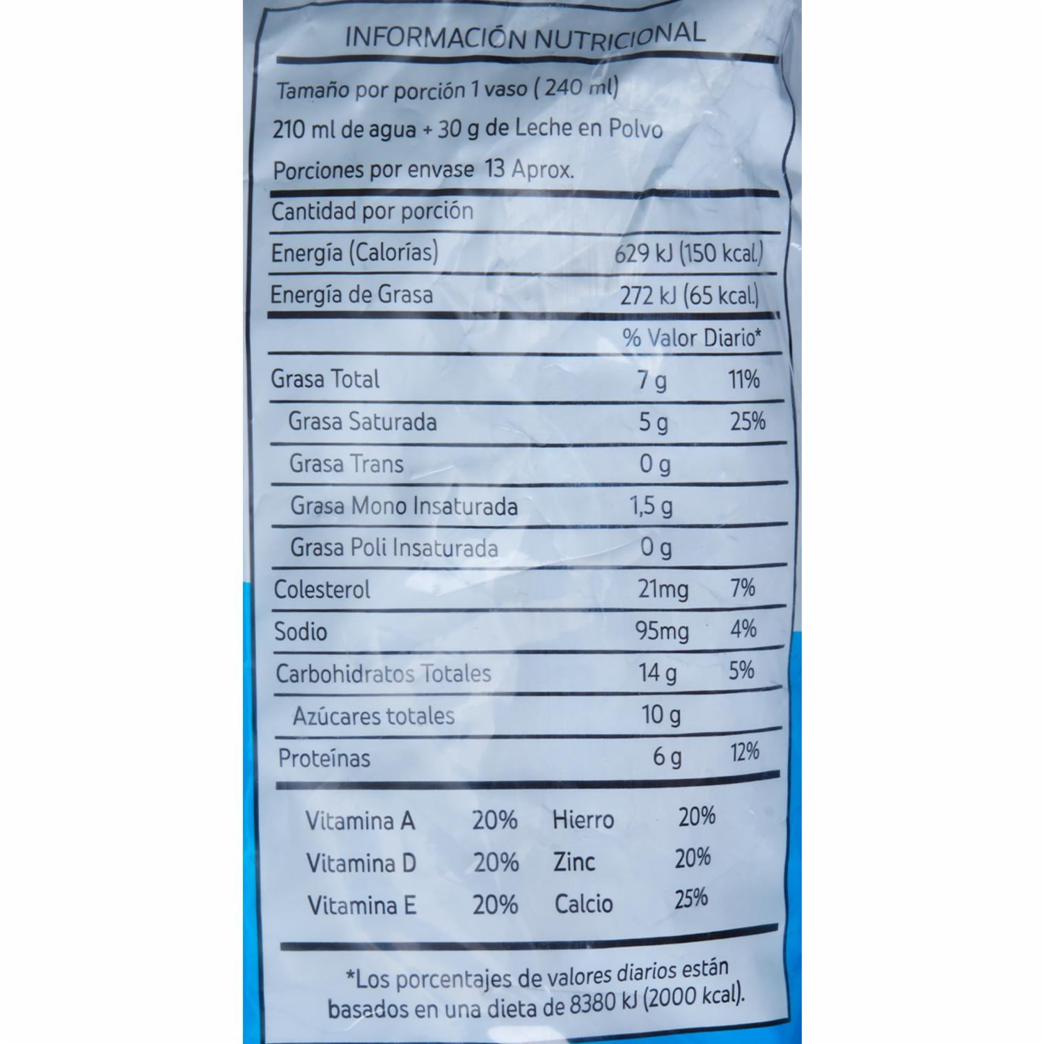 - Leche en polvo fortificada con vitaminas y fibra, ideal para complementar tu dieta diaria. Su presentación en polvo permite una fácil preparación y almacenamiento. Perfecta para toda la familia, aportando nutrientes esenciales.