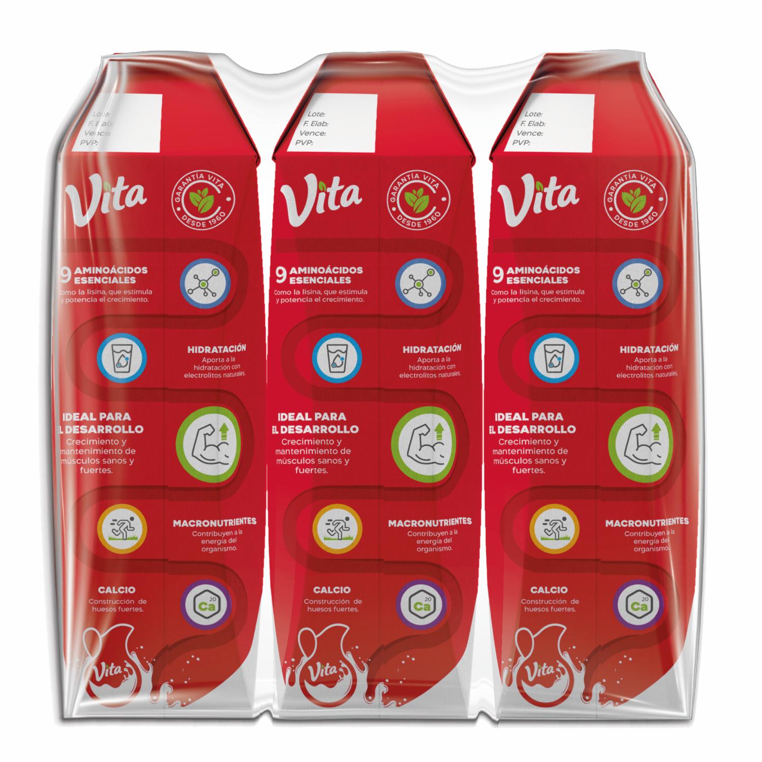 - La leche entera Vita, aporta proteína que ayuda a crecer y fortalecer los músculos, huesos y dientes, mientras que en edad adulta al mantenimiento de los mismos y el calcio para el tejido óseo