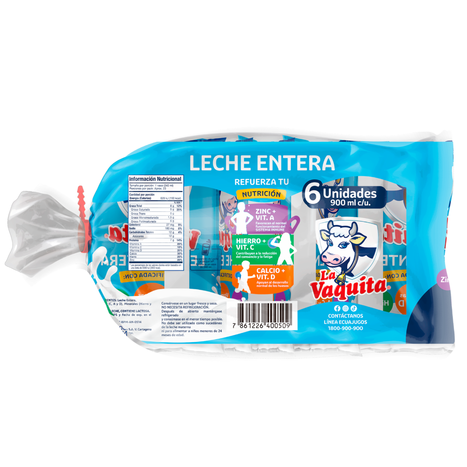 - LA VAQUITA® es una leche Entera en funda con Vitaminas A, C D, Calcio, Hierro y Zinc que fortalece el sistema inmune. Sin conservantes, sin saborizantes. ¡Disfrútala en Familia!