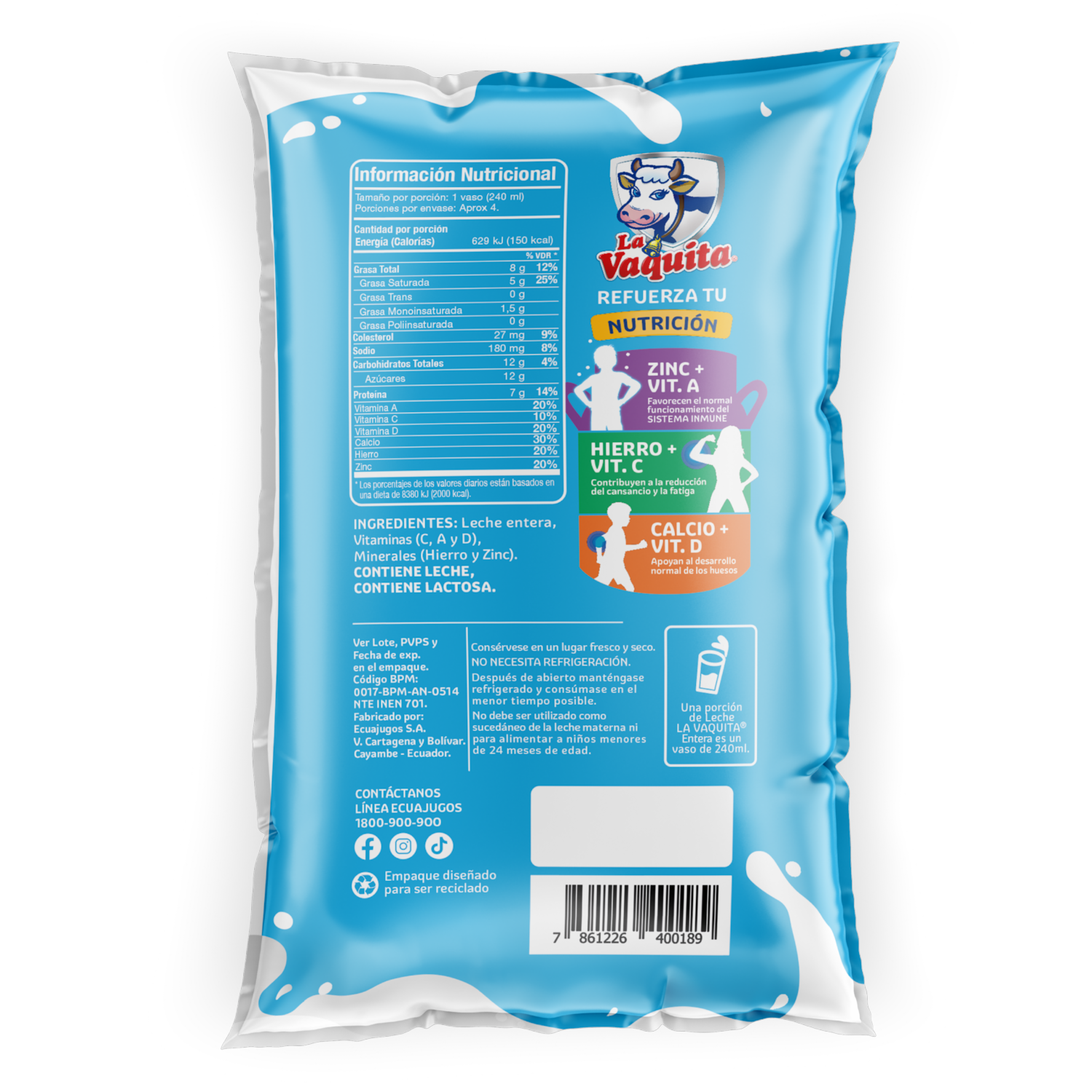 Disfruta de la nutrición y el sabor cremoso de la leche entera fortificada LA VAQUITA. Rica en vitaminas y minerales esenciales, es perfecta para desayunos, meriendas o acompañar tus recetas favoritas. Cada vaso aporta energía y bienestar para toda la familia, cuidando su salud con sabor