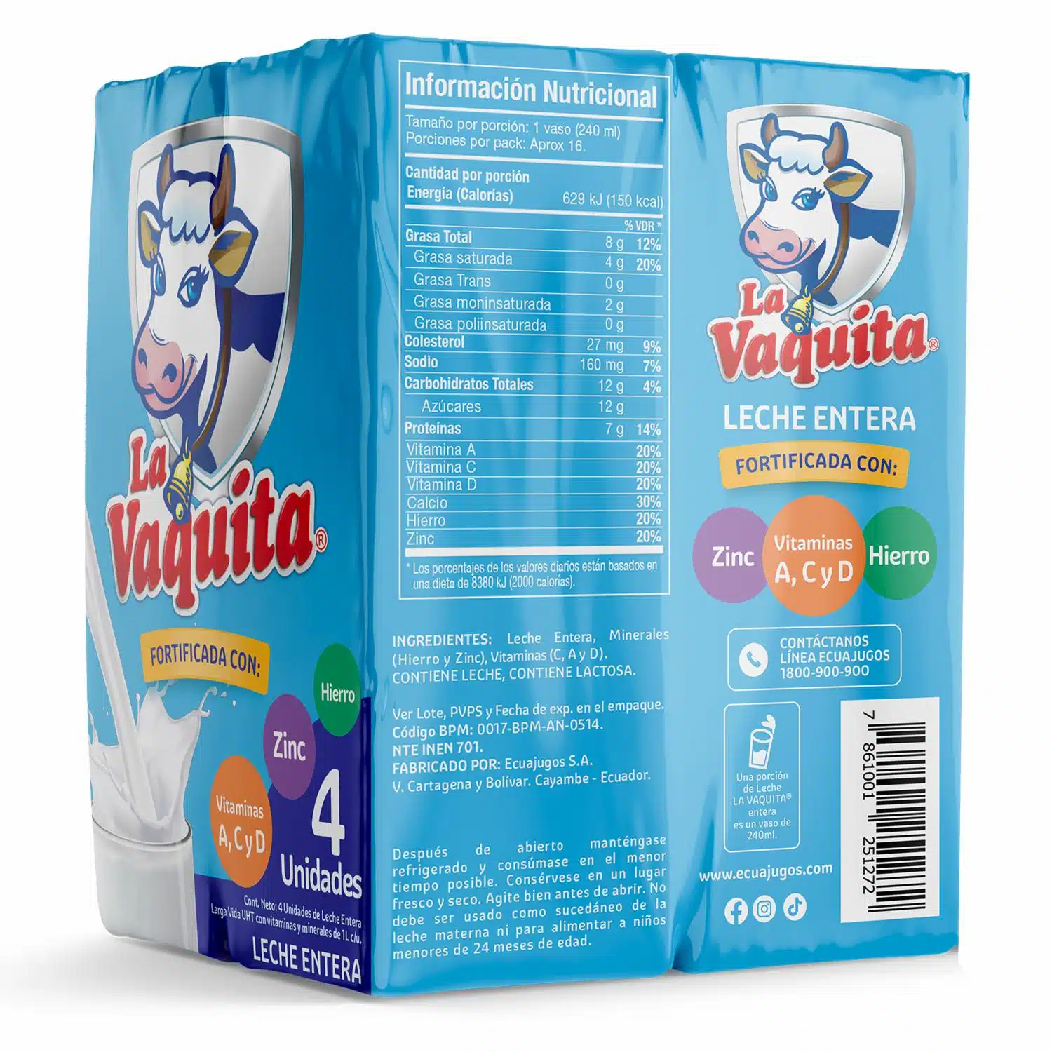Leche Entera Larga Vida UHT LA VAQUITA 4×1000 Ml