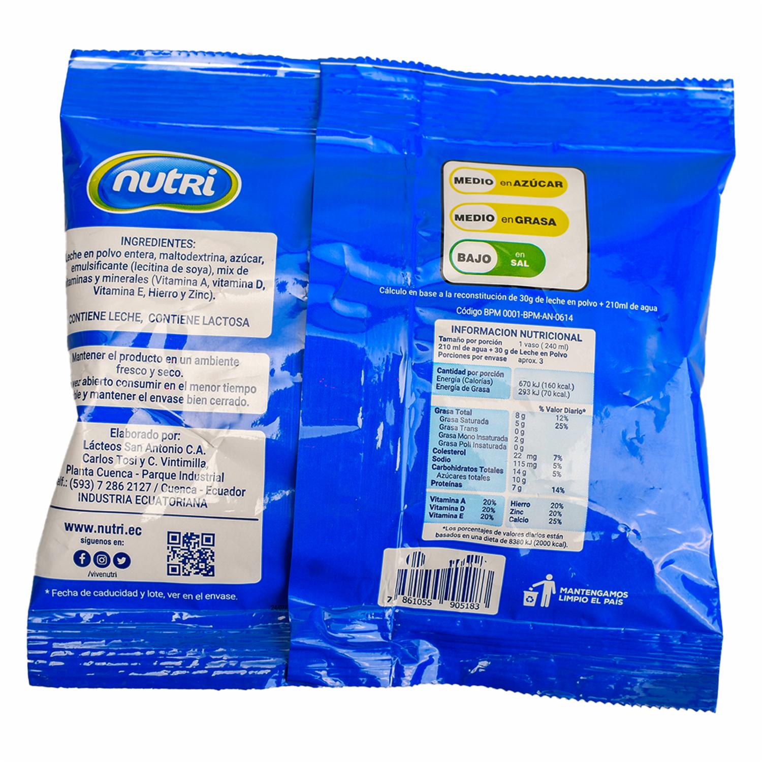 Leche en polvo. Deliciosa e Instantánea. La leche en polvo Nutri puedes disolverla tanto en agua fría como caliente. También es fortificada con las Vitaminas A, D y E