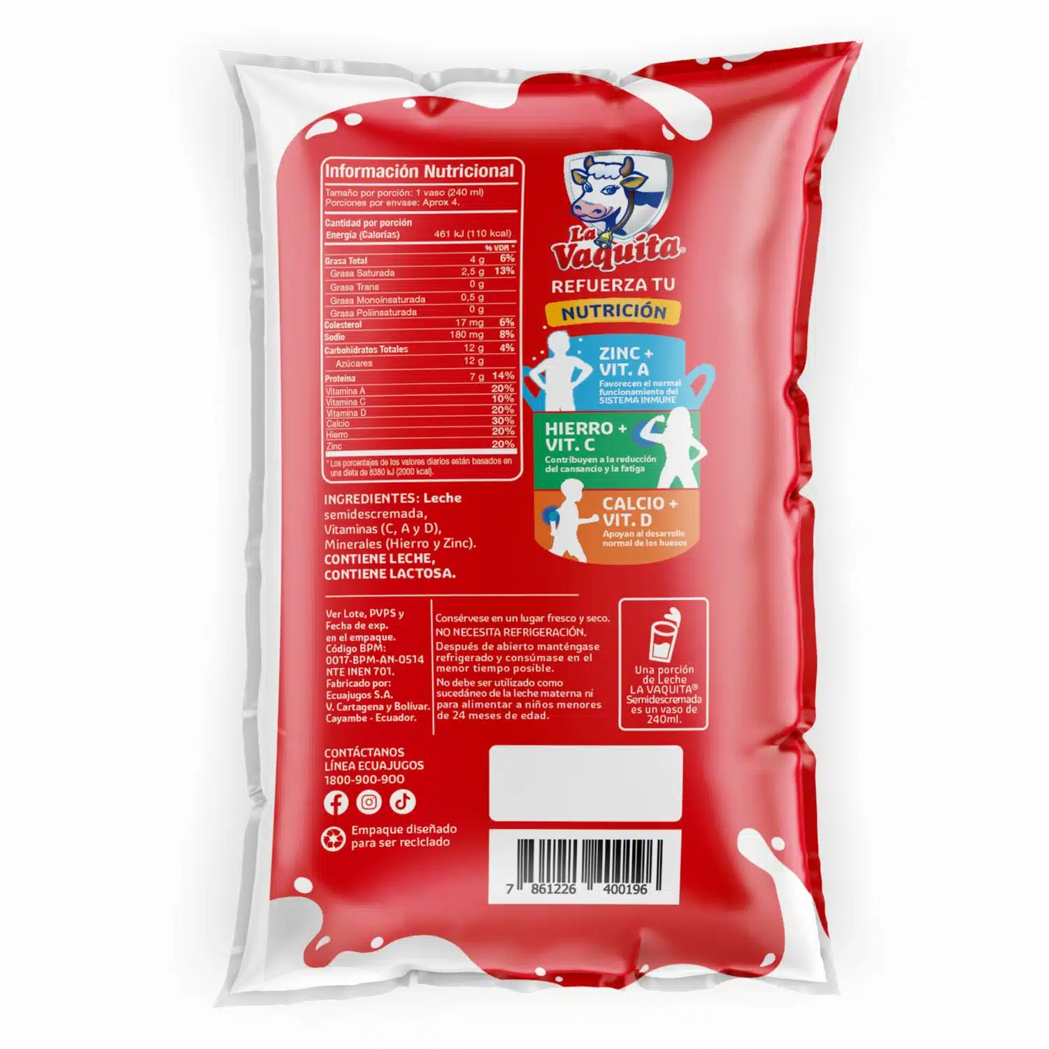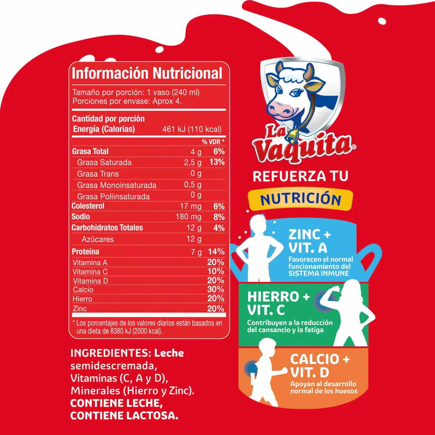 Leche Semidescremada Fortificada LA VAQUITA 900 Ml – LA VAQUITA. Disponible en nuestros locales. Precio y stock pueden variar según la tienda.