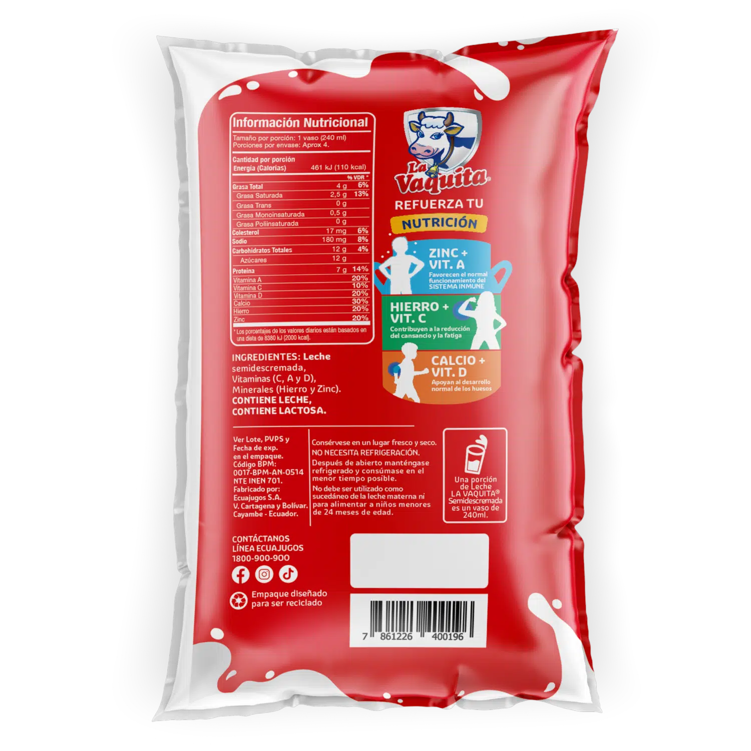 Disfruta del equilibrio perfecto entre sabor y nutrición con la leche semidescremada fortificada LA VAQUITA. Rica en vitaminas y minerales esenciales, es ideal para toda la familia, acompañando desayunos, bebidas o recetas favoritas. Cada vaso aporta bienestar y energía con cremosidad y suavidad