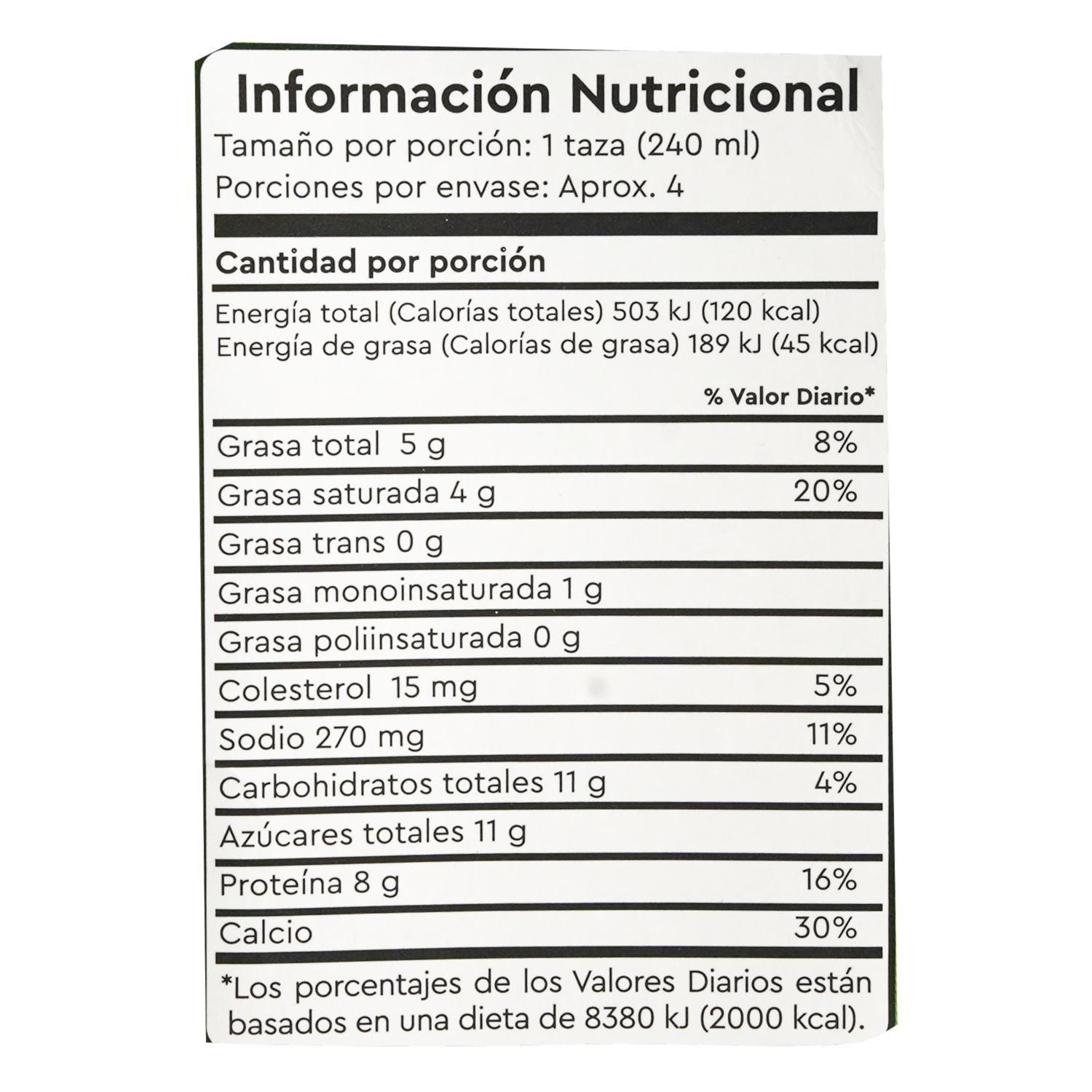 - 45 % menos de grasa con respecto a la leche entera y que conserva propiedades nutricionales como el calcio, proteínas y vitamina B