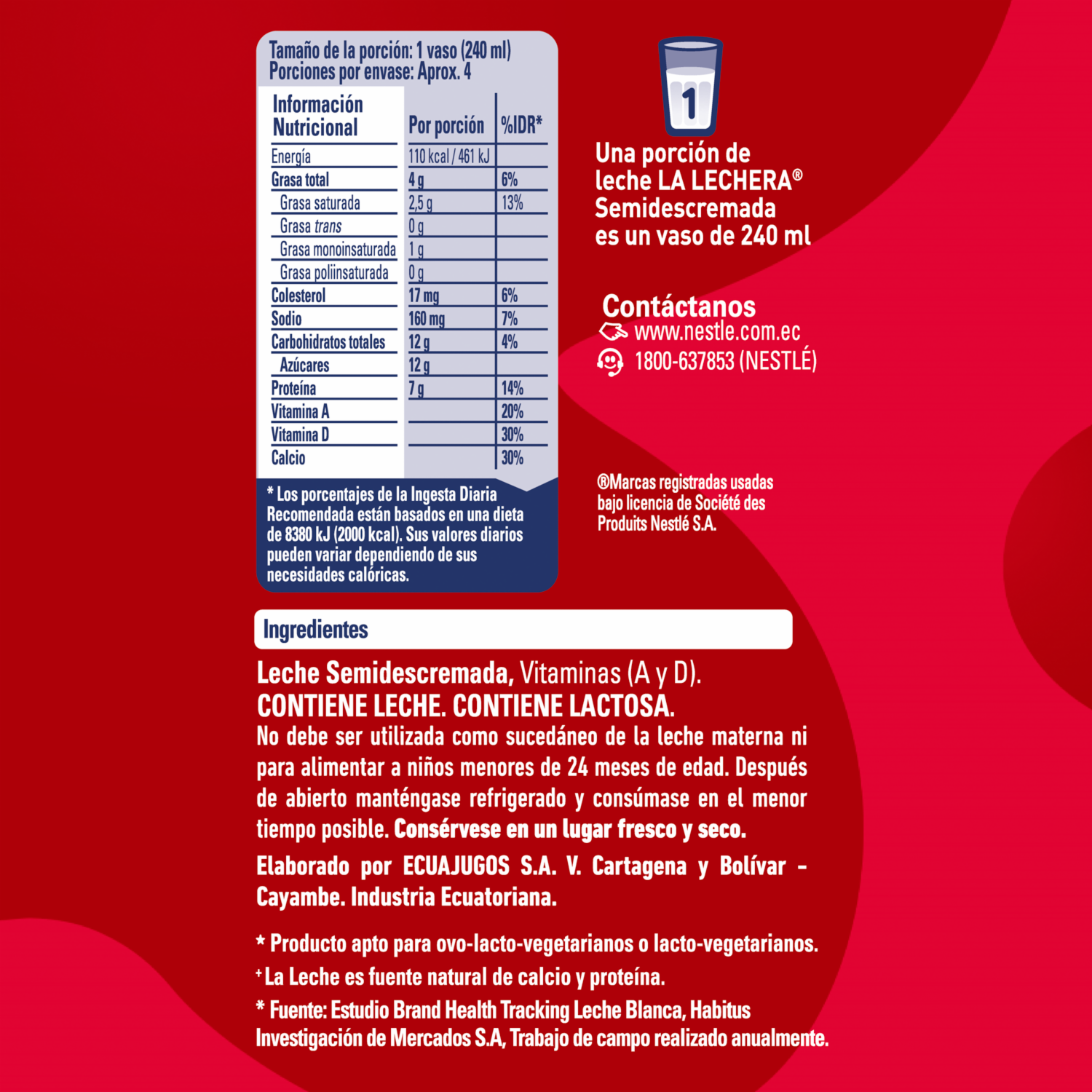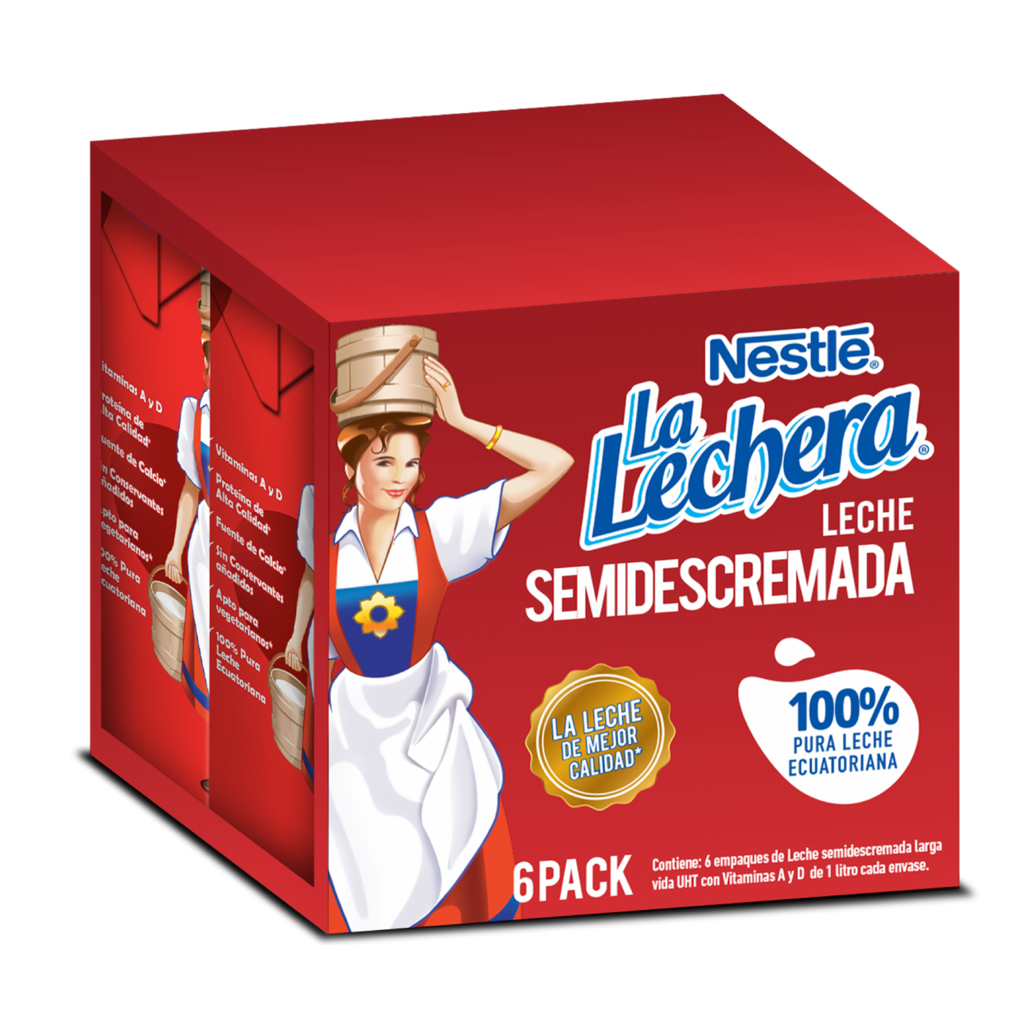 - Leche semidescremada La Lechera®, 50% menos grasa que la leche entera. Con vitaminas A y D. Proteína de alta calidad, fuente de calcio y sin conservantes añadidos