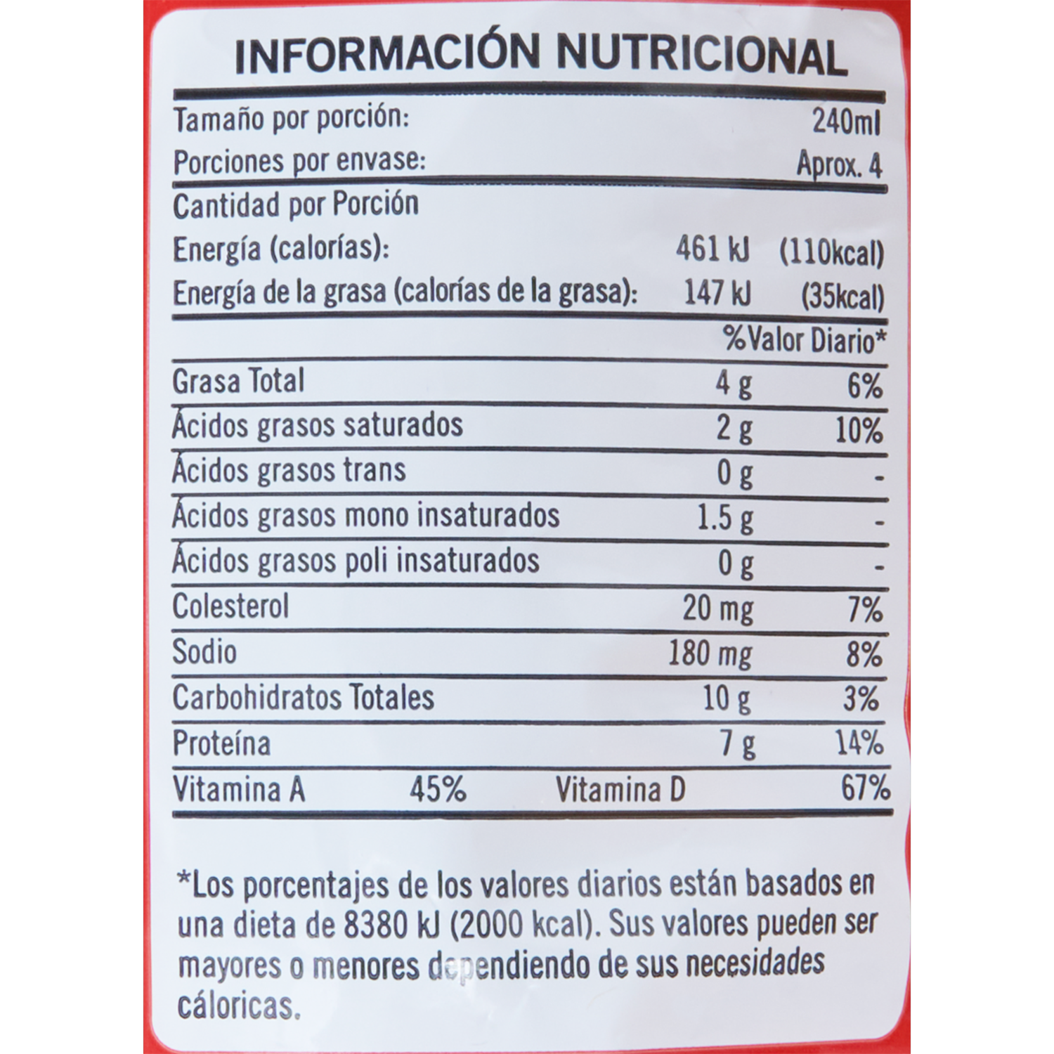 - Aporta la misma cantidad de proteínas, azúcares en forma de lactosa y calcio que la leche entera, sin embargo es bajo en grasa