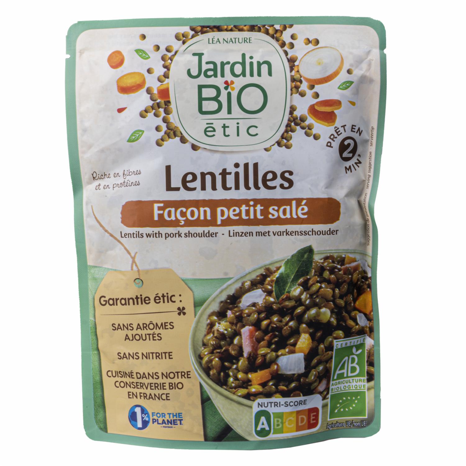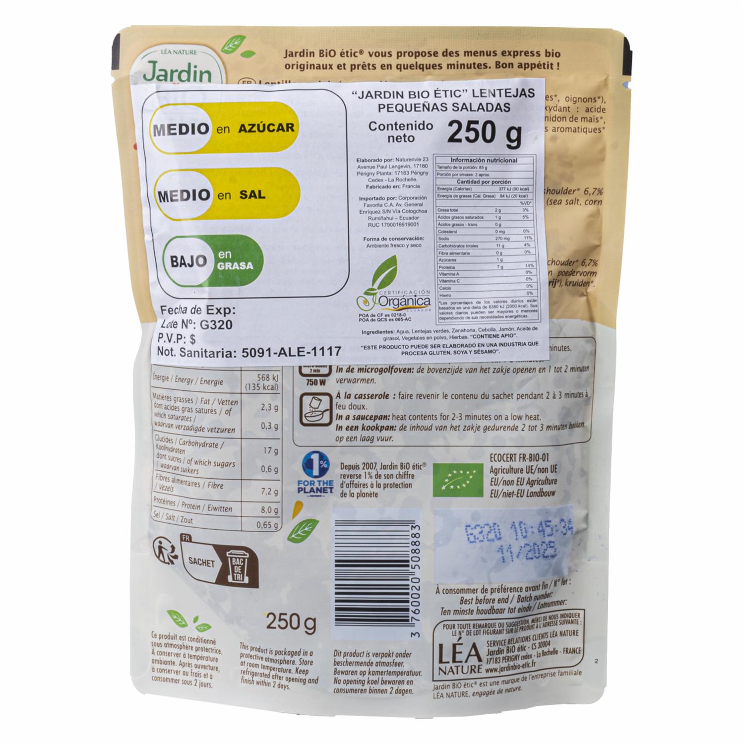- - Lentejas pequeñas de alta calidad. - Preparadas con sal para una mayor sazón. - Producto orgánico certificado por Jardin Bio. - Fuente de proteínas y fibra. - Fácil y rápido de preparar. - Ideal para ensaladas, guisos y platos vegetarianos