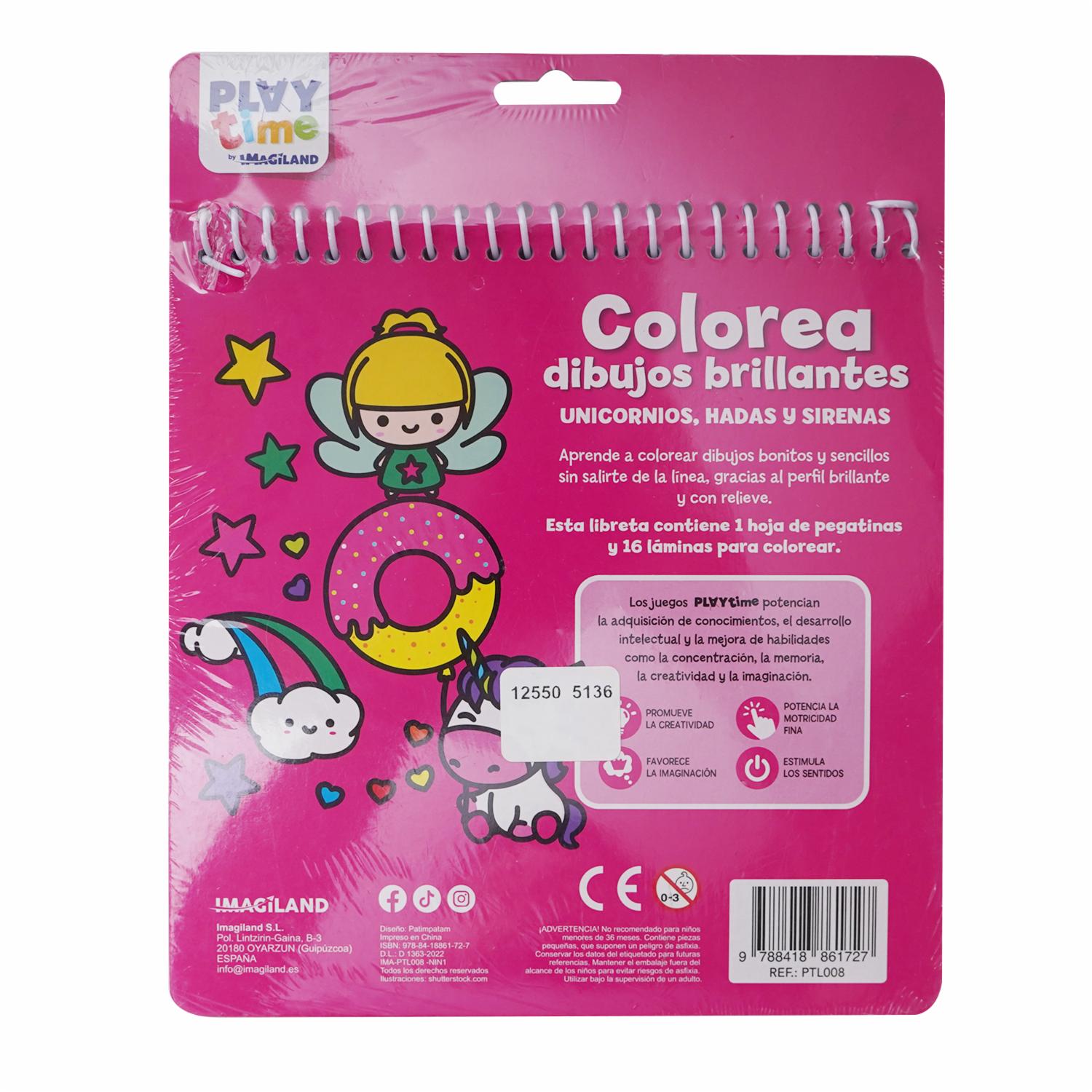 Aprende a colorear dibujos bonitos y sencillos sin salirte de la línea, gracias al perfil brillante y con relieve. Esta libreta contiene 1 hoja de pegatinas y 16 láminas para colorear