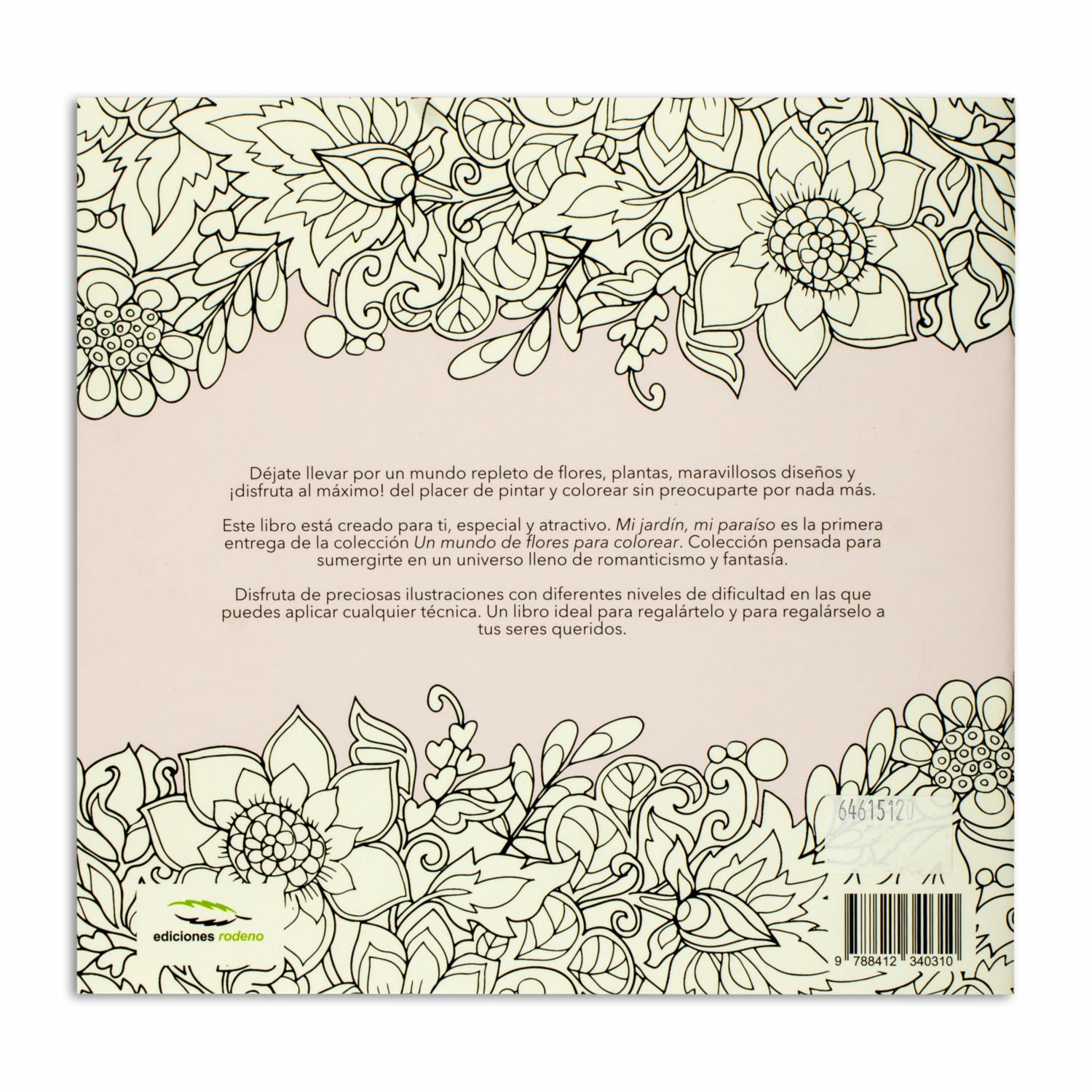 - Déjate llevar por un mundo repleto de flores, plantas, maravillosos diseños y ¡disfruta al máximo! Del placer de pintar y colorear sin preocuparon por nada más. Este libro está creado para ti, especial y atractivo. Mi jardín, mi paraíso es la primera entrega de la colección un mundo de flores para colorear. Colección pensada para sumergirte en un universo lleno de romanticismo y fantasía
