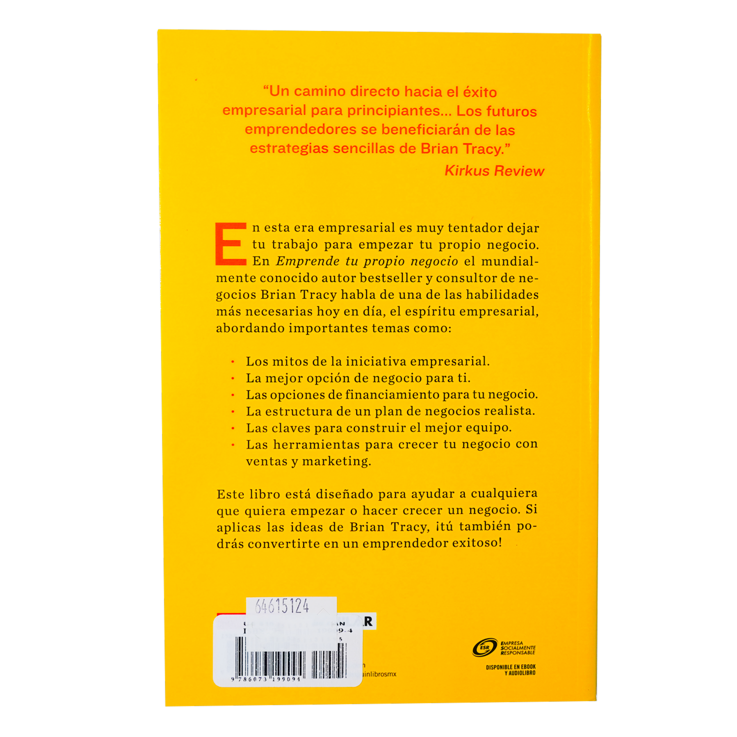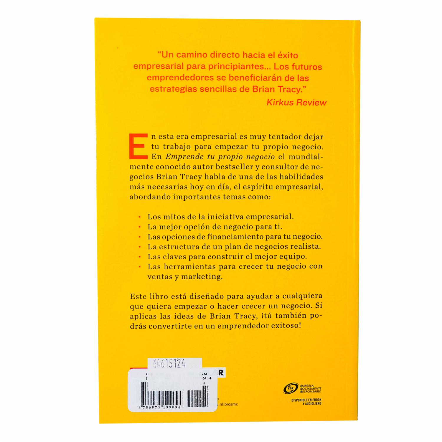 - En esta era empresarial es muy tentador dejar tu trabajo para empezar tu propio negocio. En Emprende tu propio negocio el mundialmente conocido autor bestseller y consultor de negocios Brian Tracy habla de una de las habilidades más necesarias hoy en día, el espíritu empresarial, abordando importantes temas como: Los mitos de la iniciativa empresarial. La mejor opción de negocio para ti