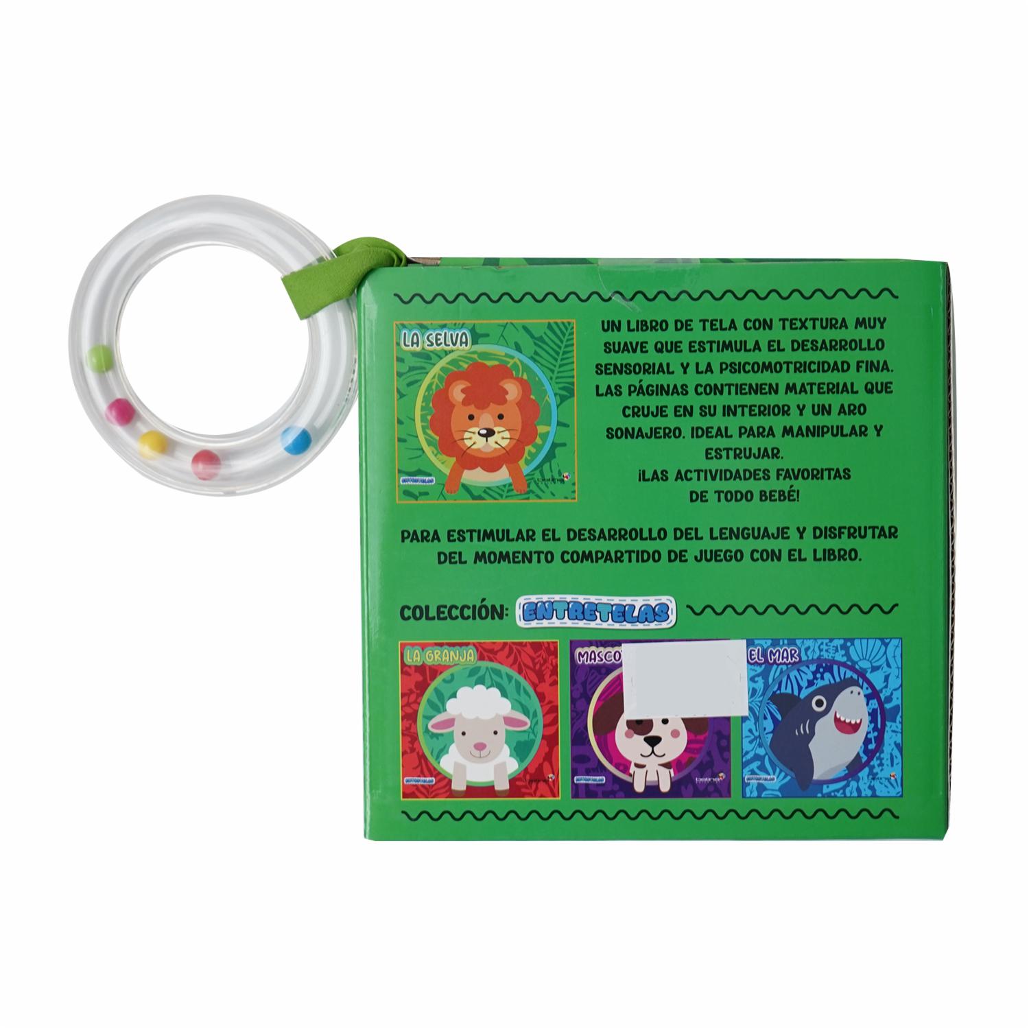 Un libro de tela con textura muy suave que estimula el desarrollo sensorial y la psicomotricidad fina. Las paginas contienen material que cruje en su interior y un aro sonajero, idea para manipular y estrujar. ¡Las actividades favoritas de todo bebé!