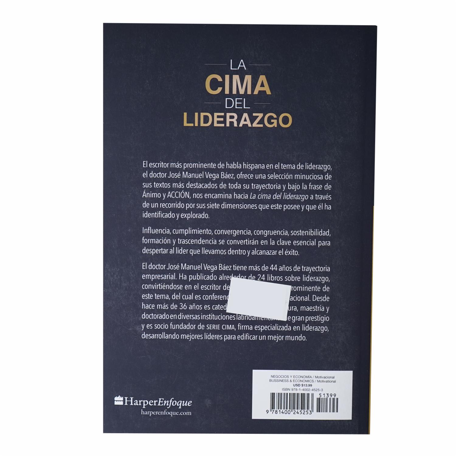• El escritor más prominente de habla hispana en el tema de liderazgo, el doctor José Manuel Vega Báez, ofrece una selección minuciosa de sus textos más destacados de toda su trayectoria y bajo la frase de Ánimo y ACCIÓN, nos encamina hacia La cima del liderazgo a través de un recorrido por sus siete dimensiones que este posee y que él ha identificado y explorado