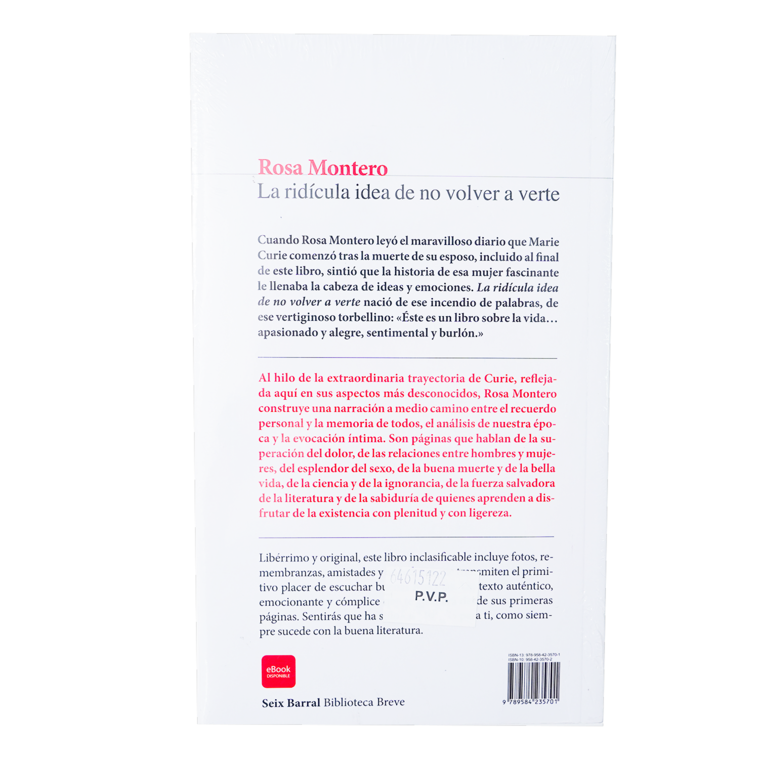 - Cuando Rosa Montero leyó el maravilloso diario que Marie Curie comenzó tras la muerte de su esposo, y que se incluye al final de este libro, sentó que la historia de esa mujer fascinante que se enfrentó a su época le llenaba la cabeza de ideas y emociones . La ridícula idea de no volver a verte nació de ese incendio de palabras, de ese vertiginoso torbellino