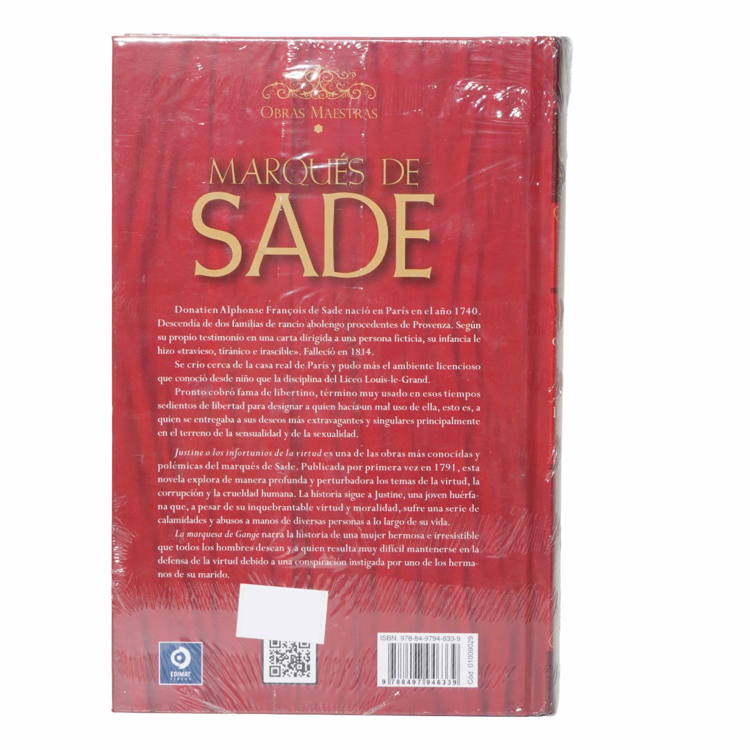 - Marqués de Sade pronto cobró fama de libertino, término muy usado en esos tiempos sedientos de libertad para designar a quien hacía un mal uso de ella, esto es, a quien se entregaba a sus deseos más extravagantes y singulares principalmente en el terreno de la sensualidad y de la sexualidad. Esta edición de las Obras Maestras de Marqués de sade consta de cuatro volúmenes. Este primer volumen contiene las siguientes obras: Justine o los infortunios de la virtud y La marquesa de Gange
