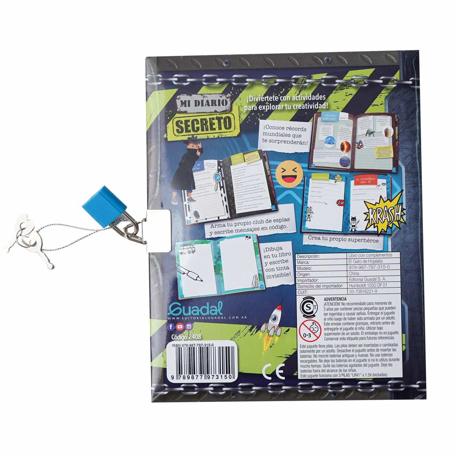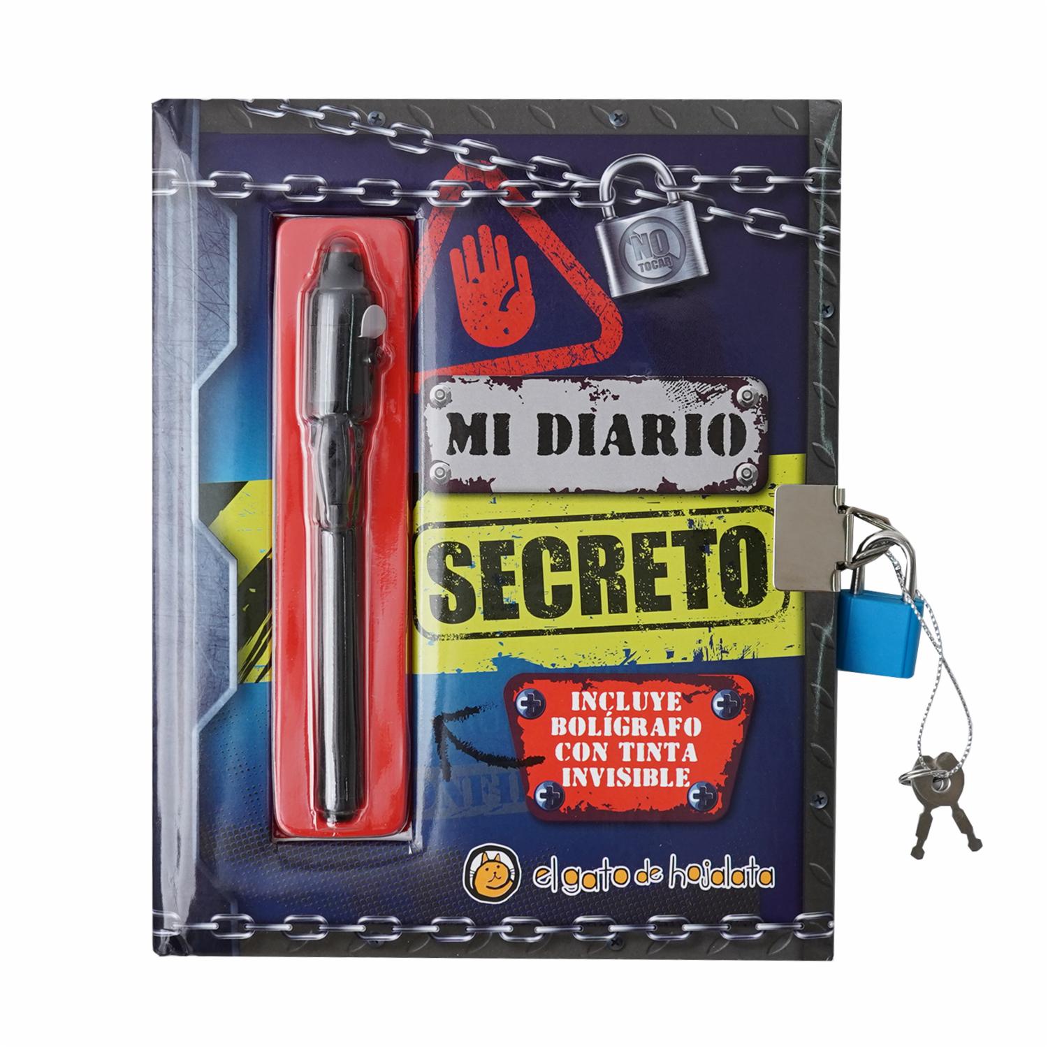 Diario lleno de diversión y actividades. Propuestas muy creativas y variadas de los temas que más les interesan a los chicos. Además trae un bolígrafo que escribe transparente y solo se puede ver lo escrito con una linterna ultravioleta, también incluida en el capuchón del bolígrafo