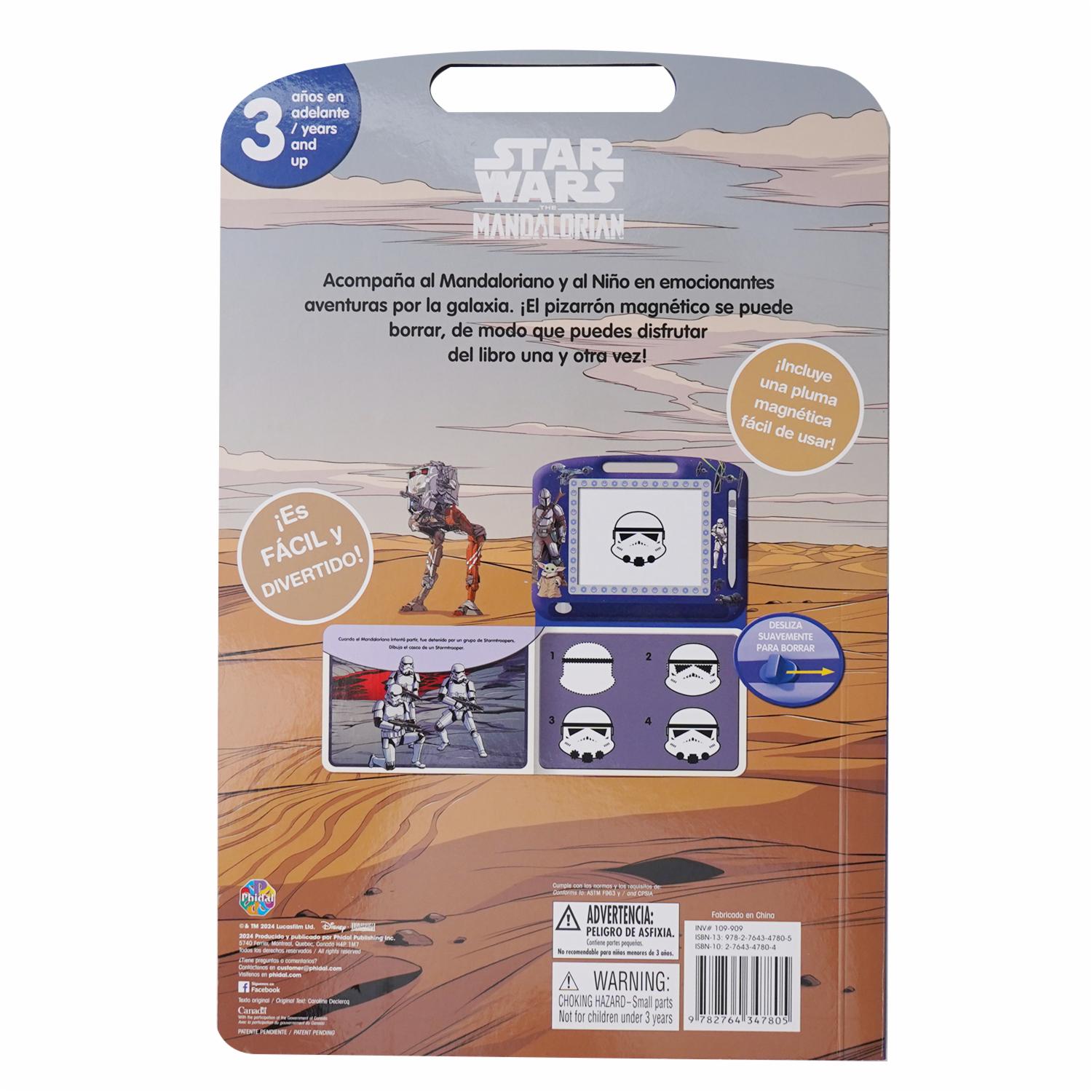 - Acompaña al mandaloriano y al Niño en emocionantes aventuras por la galaxia. ¡El pizarrón magnético se puede borrar, de modo que puedes disfrutar del libro una y otra vez