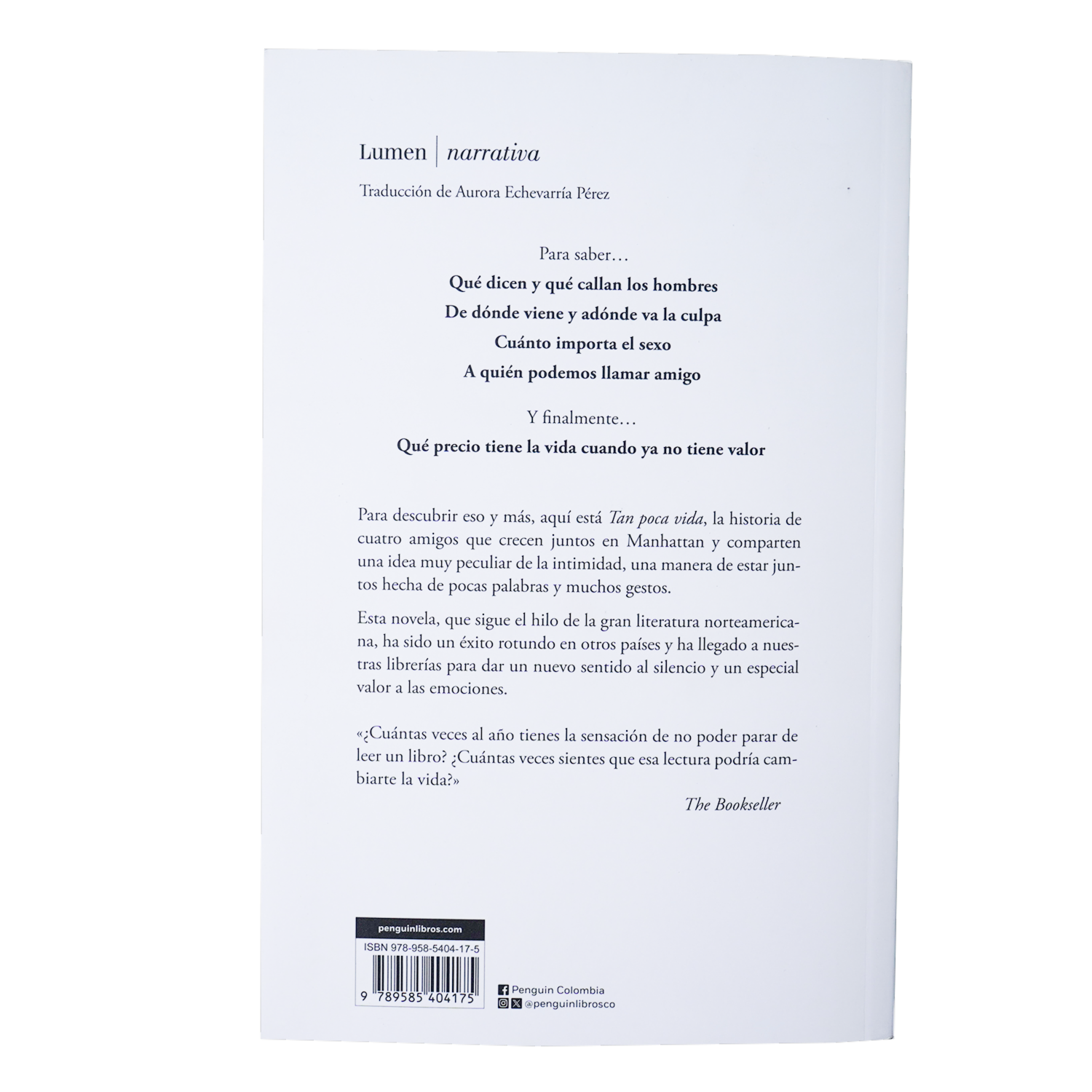 - Para descubrir... Qué dicen y qué callan los hombres. De dónde viene y dónde va la culpa. Cuánto importa el sexo. A quien podemos llamar amigo. Y finalmente... Qué precio tiene la vida y cuándo deja de tener valor. Para descubrir eso y más, aquí está Tan poca vida, una historia que recorre más de tres décadas de amistad en la vida de cuatro hombres que crecen juntos en Manhattan