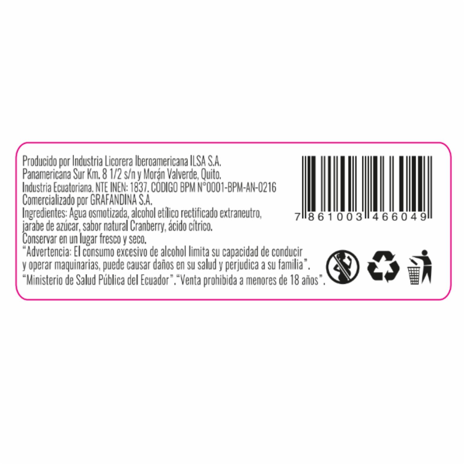- Licor con caracteristicas sensoriales a cranberry, ligeramente dulce.