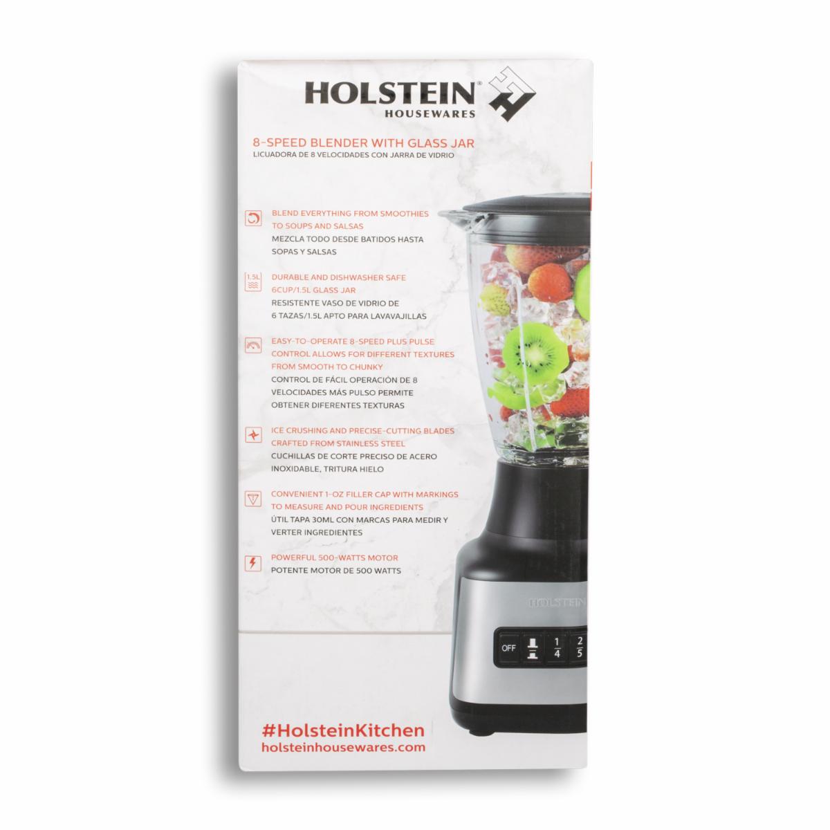 • Caracteristicas: -Marca: Holstein Housewares. -Capacidad: Jarra de vidrio de 1.5 litros (6 tazas), resistente y apta para lavavajillas. -Potencia: Motor de 500W, ideal para triturar hielo y preparar recetas variadas. -Velocidades: 8 ajustes + función de pulso para texturas desde suaves hasta gruesas. -Materiales: Construcción en acero inoxidable y plástico duradero. -Funciones: Licúa batidos, sopas, salsas y más. -Cuchillas: Diseñadas para cortar y triturar con precisión