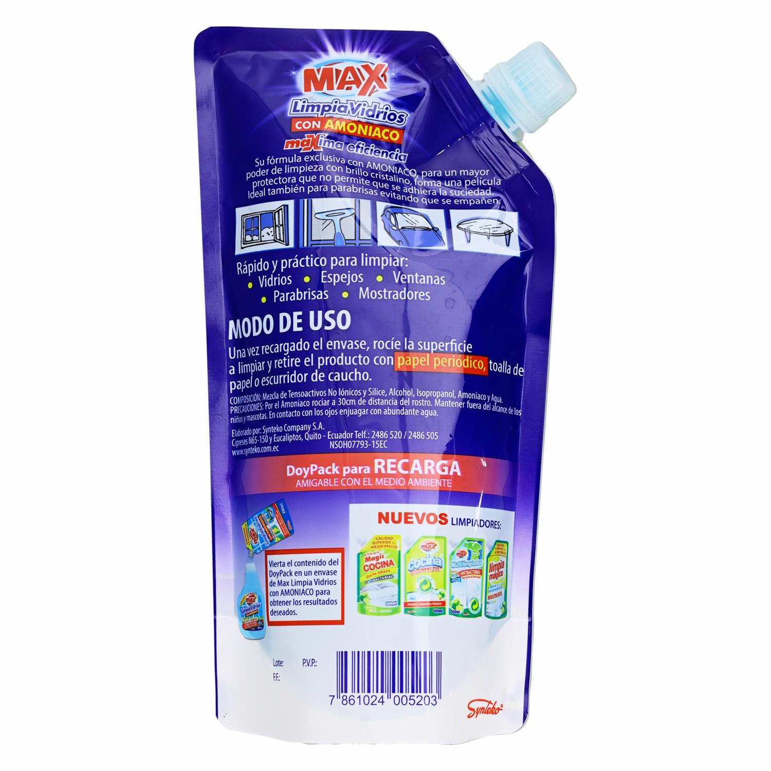 Limpia Vidrios Con Amoniaco Doypack MAX 500 Ml – MAX. Disponible en nuestros locales. Precio y stock pueden variar según la tienda.