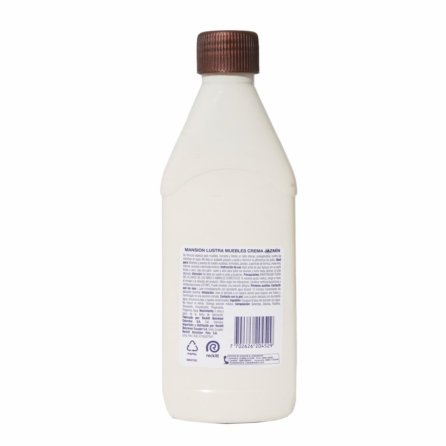 - Mansion Crema Jazmín Es Un Lustra Muebles Que Garantiza La Protección Que Ellos Se Merecen. Su Fórmula Forma Una Capa Protectora Y Brillante Que Ayuda A Proteger Contra Las Manchas De Agua Y A Disminuir La Adherencia De Polvo Dejando Una Agradable Fragancia
