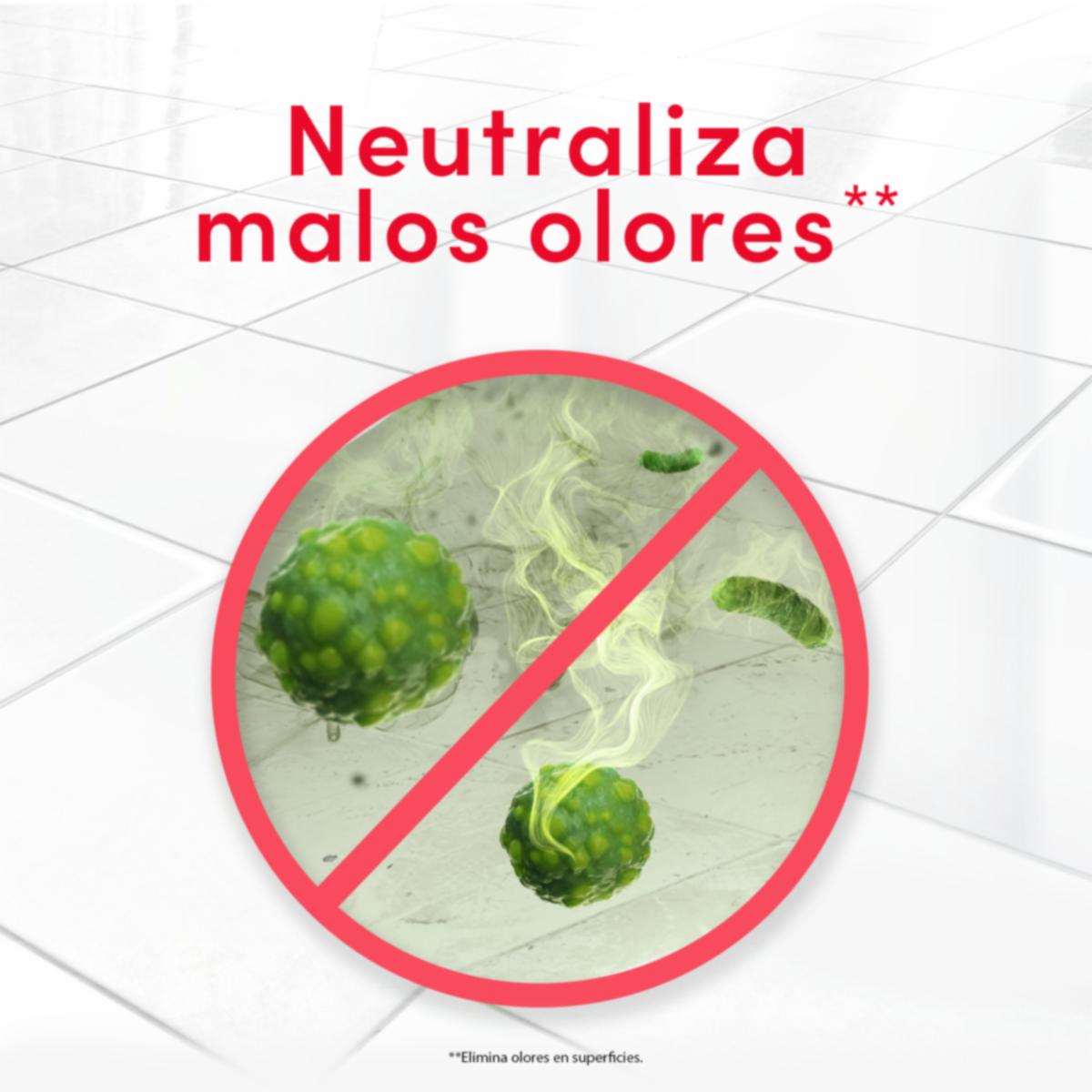 - Déjate envolver por su esencia floral, además elimina el 99.9% de las bacterias que se alojan en los pisos y paredes de tu hogar. Sus partículas activas y fragancias concentradas depuran la grasa que se adhiere a las paredes de tu cocina, el sarro del baño, y los gérmenes que viven en las superficies de tus pisos