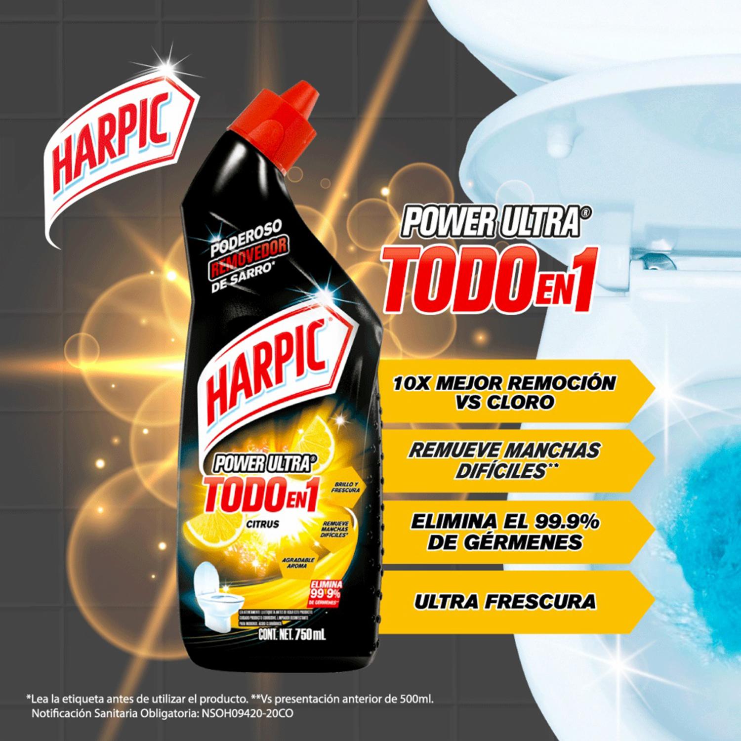 Harpic Power Ultra Todo En 1 Citrus Proporcionan Limpieza Y Desinfección Para Inodoros. Su Formula Remueve Manchas Difíciles, Elimina Gérmenes Y Deja El Inodoro Limpio Y Fresco Gracias A Su Fragancia. Lea Atentamente La Etiqueta Del Producto Antes De Su Uso