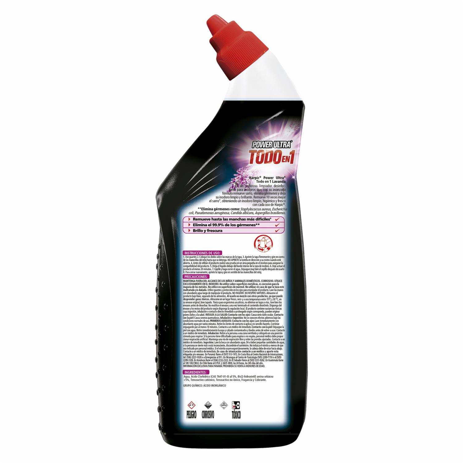 Harpic Power Ultra Todo En 1 Lavanda Proporcionan Limpieza Y Desinfección Para Inodoros. Su Formula Remueve Manchas Difíciles, Elimina Gérmenes Y Deja El Inodoro Limpio Y Fresco Gracias A Su Fragancia. Lea Atentamente La Etiqueta Del Producto Antes De Su Uso