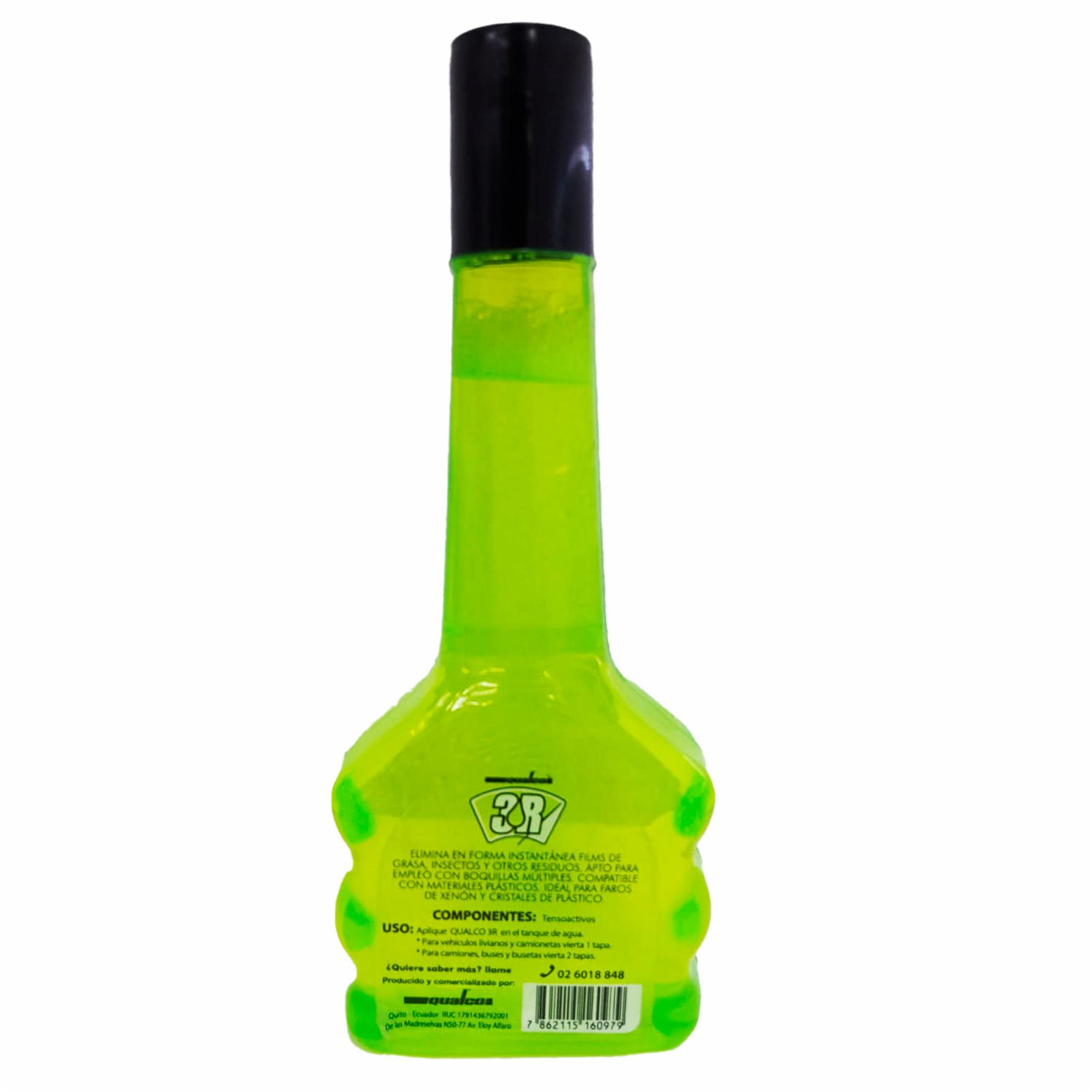 - DESCRIPCIÓN: QUALCO 3R LIMPIAPARABRISAS: para diluir en el agua de las plumas. De uso directo en el tanque de agua de plumas. Elimina restos de insectos, grasa, polvo y otras suciedades. Secado rápido. Dosificación hasta 2.5 litros de agua