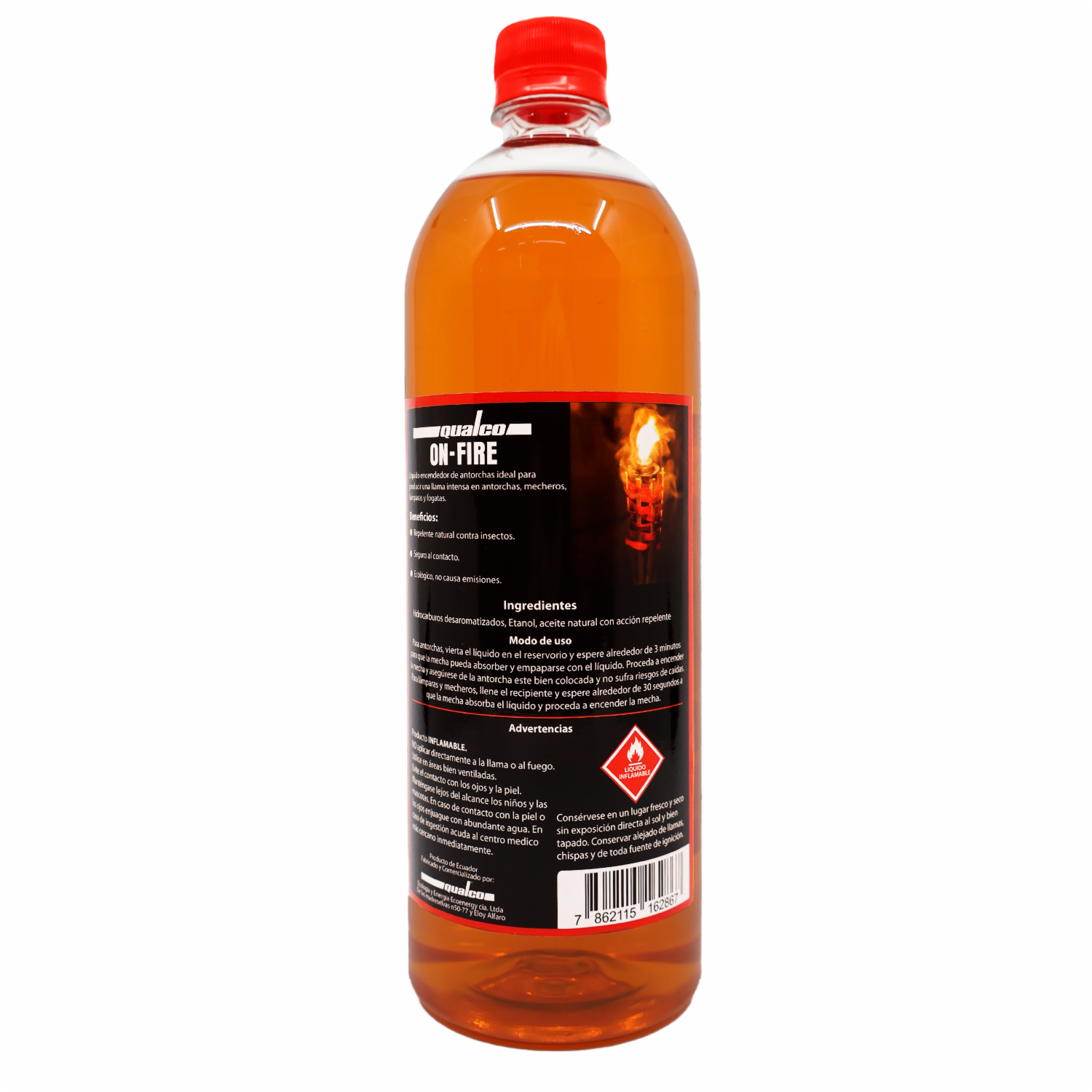 - QUALCO ON FIRE: Líquido encendedor de antorchas, no genera hollín ni humo negro, forma una llama limpia. Contiene un repelente natural no tóxico completamente seguro. Encendido inmediato 100% seguro y biodegradable. Libre de compuestos hidrocarburos aromáticos
