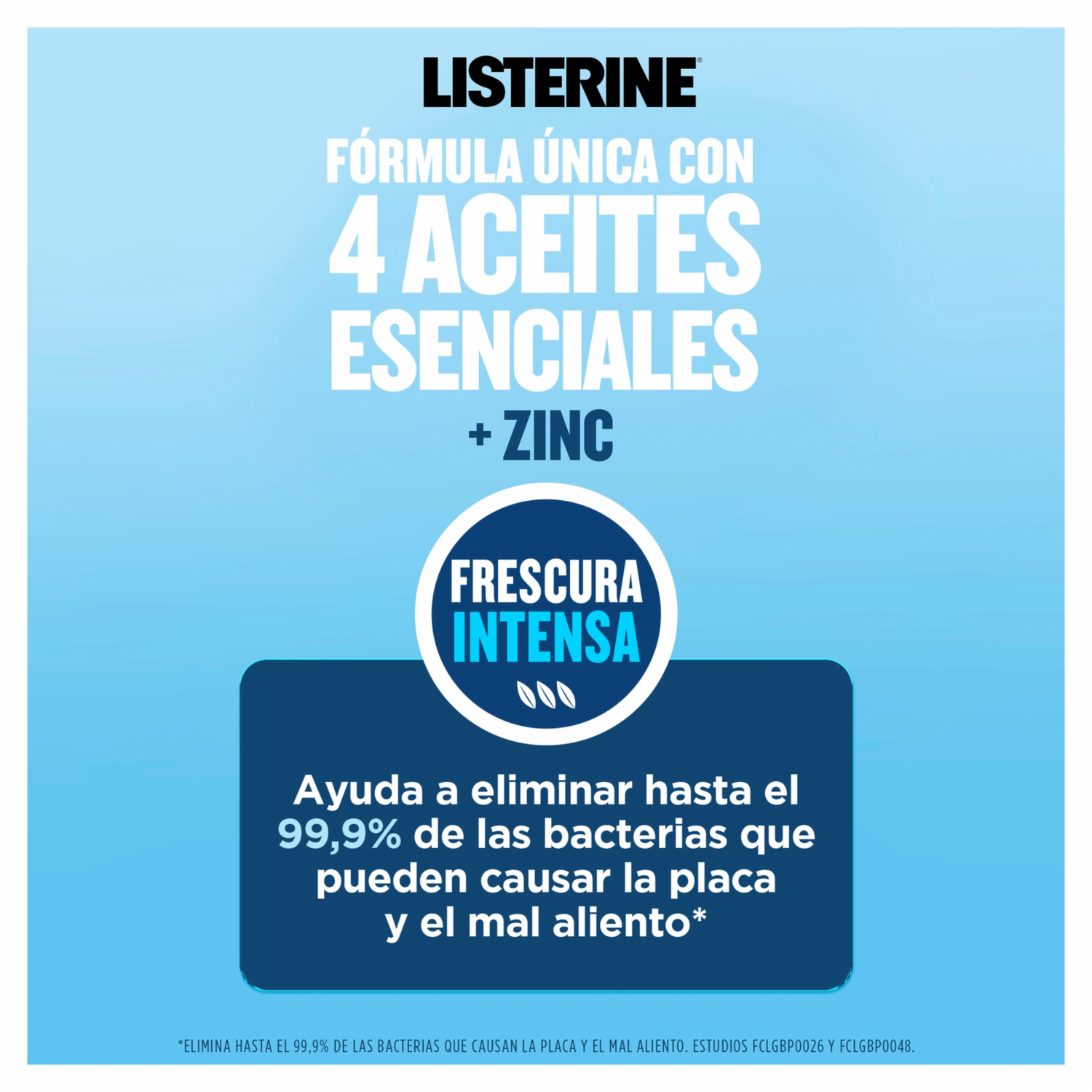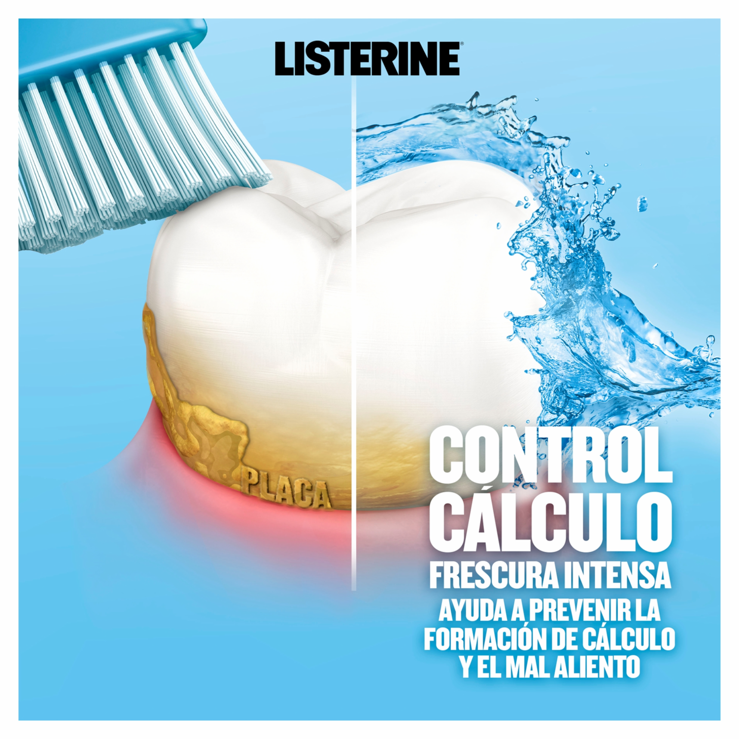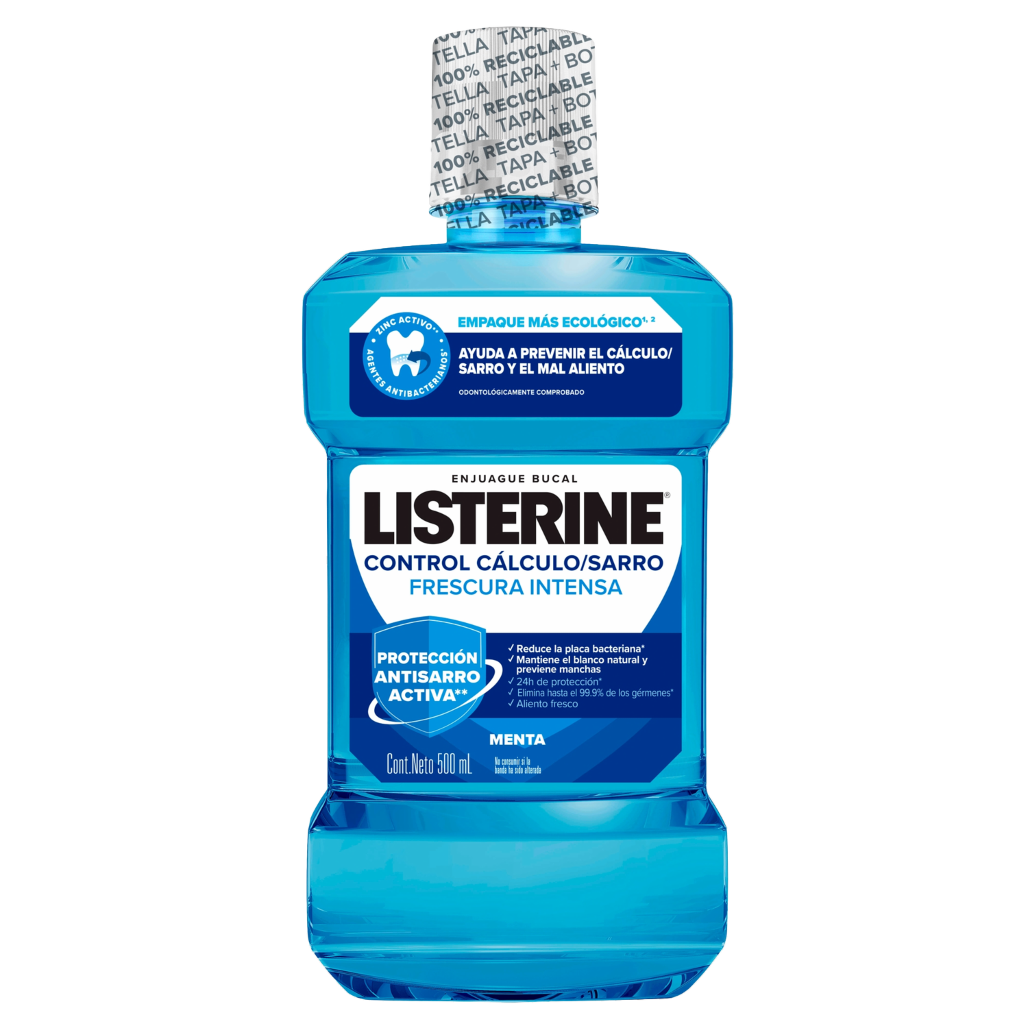 - Gracias a la fórmula única de Listerine Control Cálculo de 4 Aceites Esenciales (mentol, timol, eucaliptol y salicilato de metilo) es efectivo en eliminar hasta el 99.9% de las bacterias que causan la placa, caries y el mal aliento. Además mantiene las encías saludables. Contiene Cloruro de Zinc cuya acción es prevenir la formación de sarro (cálculo dental). Ninguna acción antibacteriana es más profunda que la de Listerine con protección hasta por 24 horas