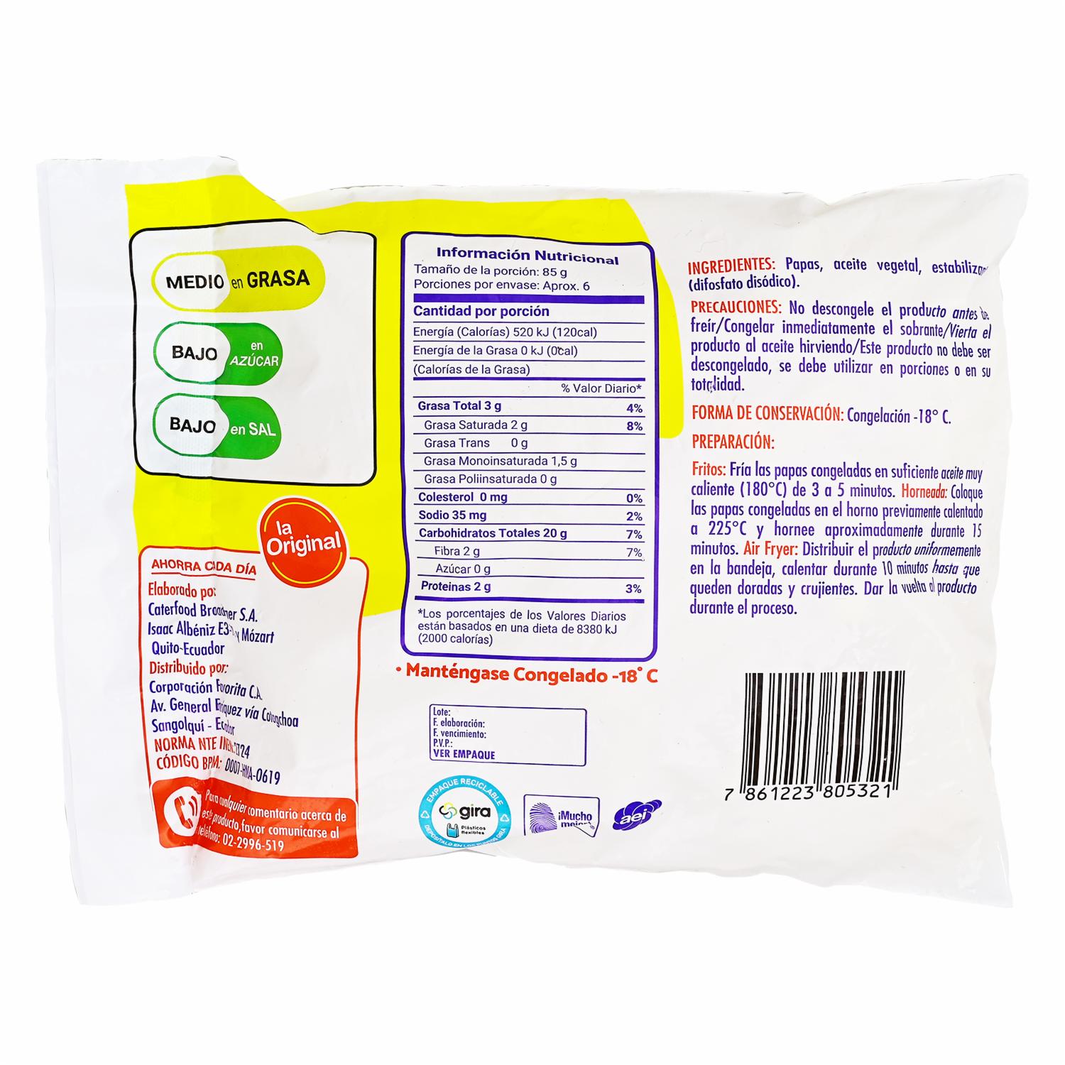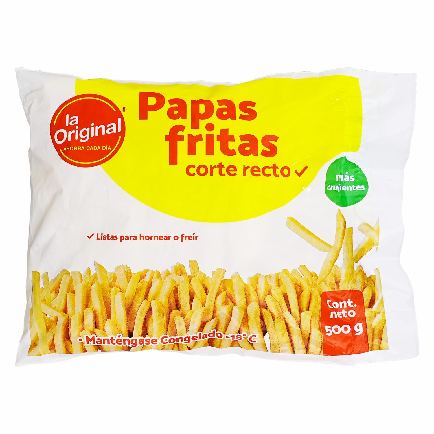 - Disfruta del sabor clásico con las Papas Fritas de corte recto LA ORIGINAL. Congeladas para mayor practicidad, listas para freír u hornear en minutos. Crujientes por fuera y suaves por dentro, son el acompañante perfecto para cualquier comida. Presentación de 500 gramos, ideal para porciones individuales o pequeñas familias