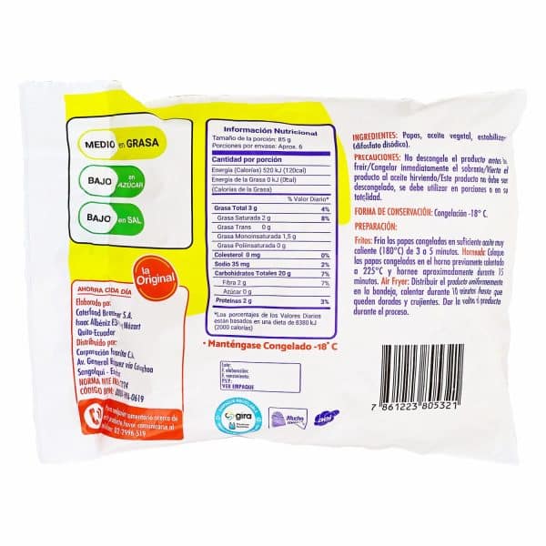 Disfruta del sabor clásico con las Papas Fritas de corte recto LA ORIGINAL. Congeladas para mayor practicidad, listas para freír u hornear en minutos. Crujientes por fuera y suaves por dentro, son el acompañante perfecto para cualquier comida. Presentación de 500 gramos, ideal para porciones individuales o pequeñas familias