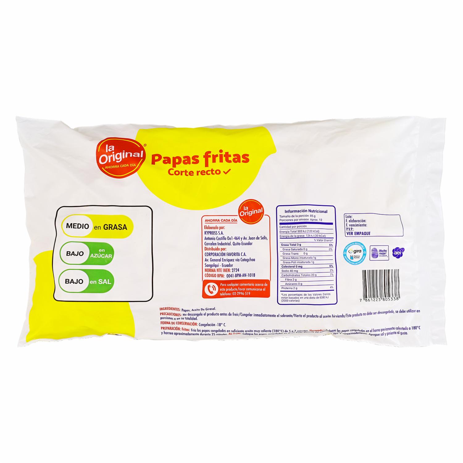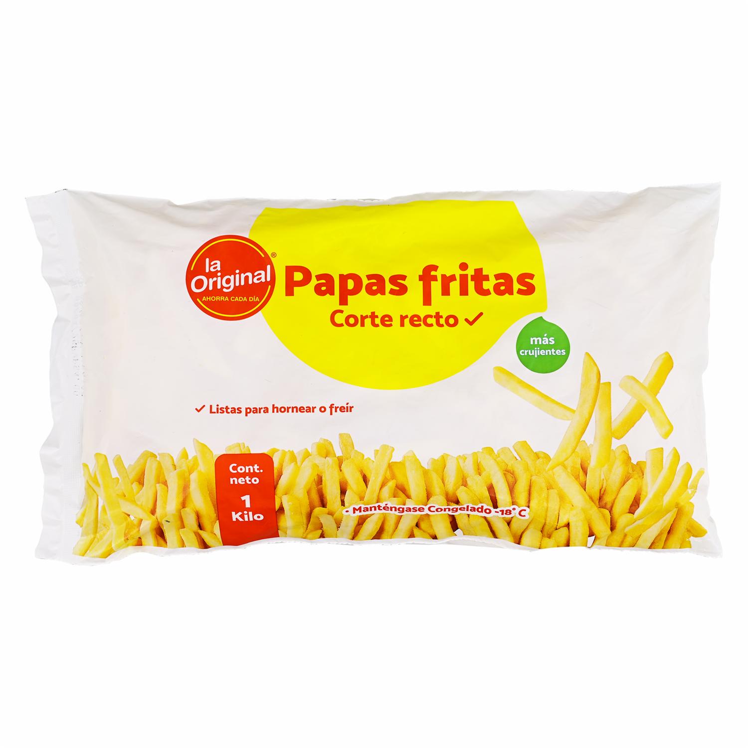 - Las clásicas papas fritas de corte recto que nunca fallan. LA ORIGINAL te ofrece una opción congelada lista para freír u hornear, con una textura crujiente por fuera y suave por dentro. Perfectas para acompañar tus platos favoritos o disfrutar como snack. Presentación de 1 kg, ideal para compartir
