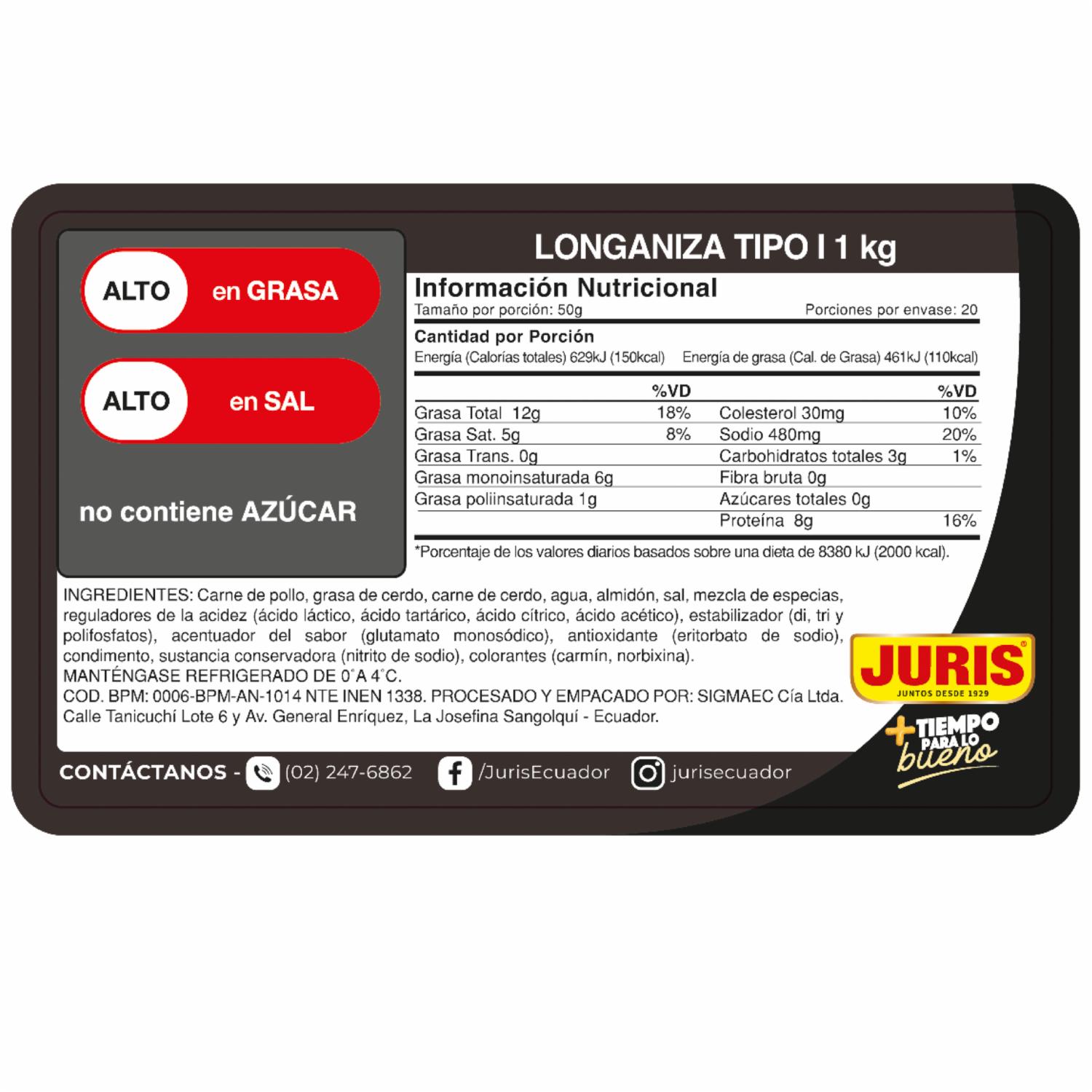 Longaniza Tipo I JURIS 1000 G – JURIS. Disponible en nuestros locales. Precio y stock pueden variar según la tienda.