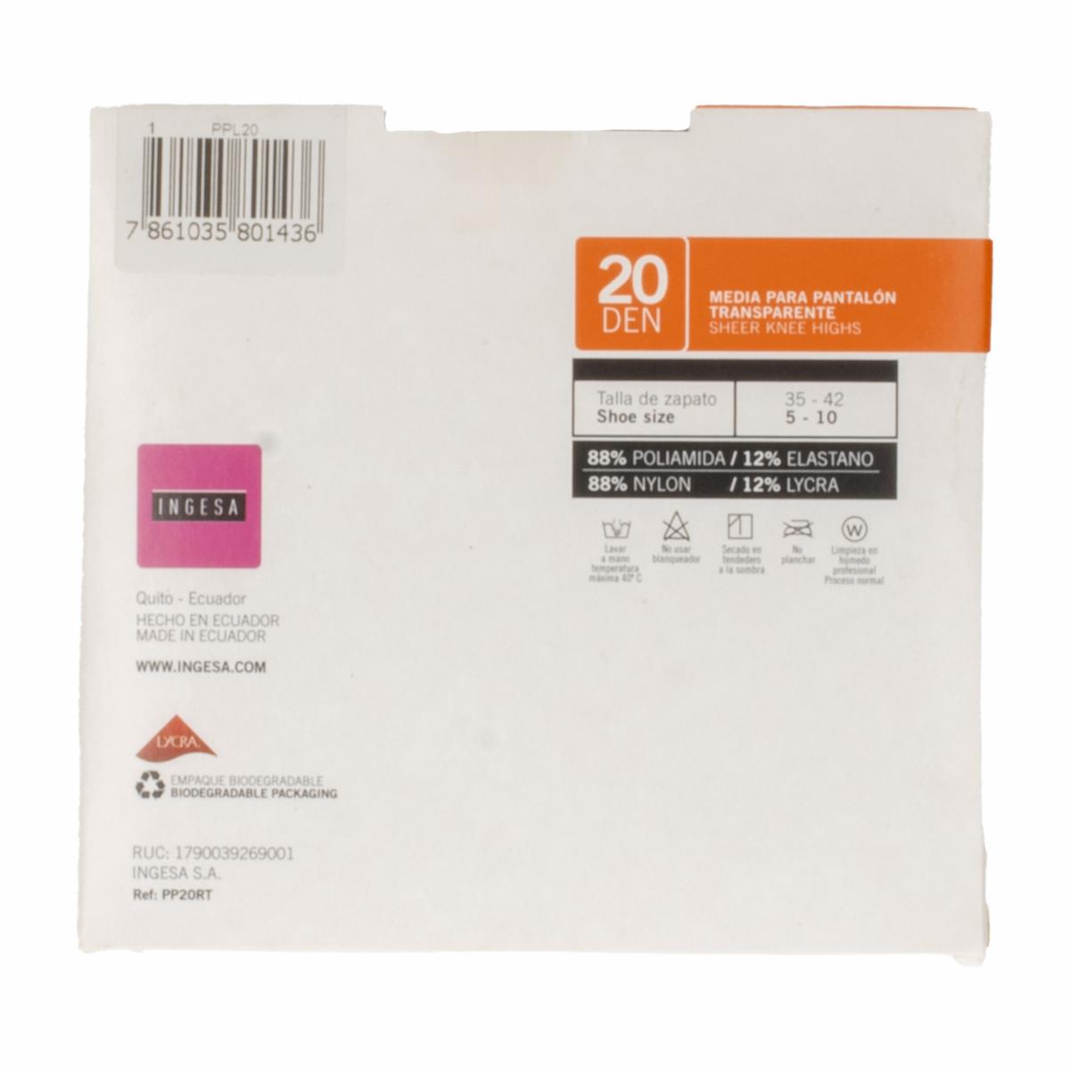 - Descubre el placer de caminar con confianza y estilo. Las medias de dama INGESA para pantalón de lycra transparente 20 Den, no solo son una prenda básica, sino una experiencia de comodidad y elegancia que te acompañará a lo largo del día