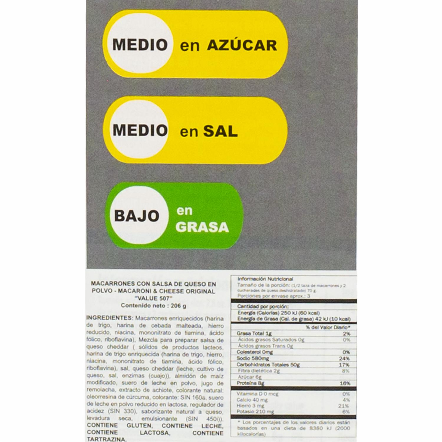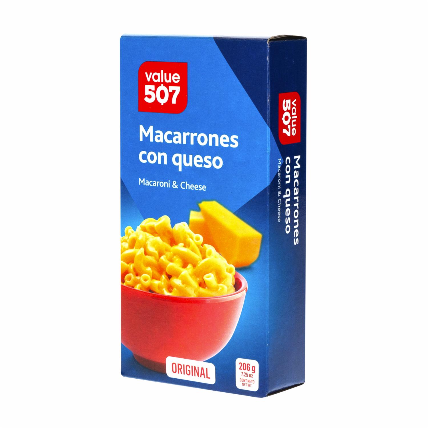 - Los macarrones con salsa de queso en polvo VALUE 507, en presentación de 206 g, es una opción práctica y deliciosa para disfrutar de una comida rápida y reconfortante