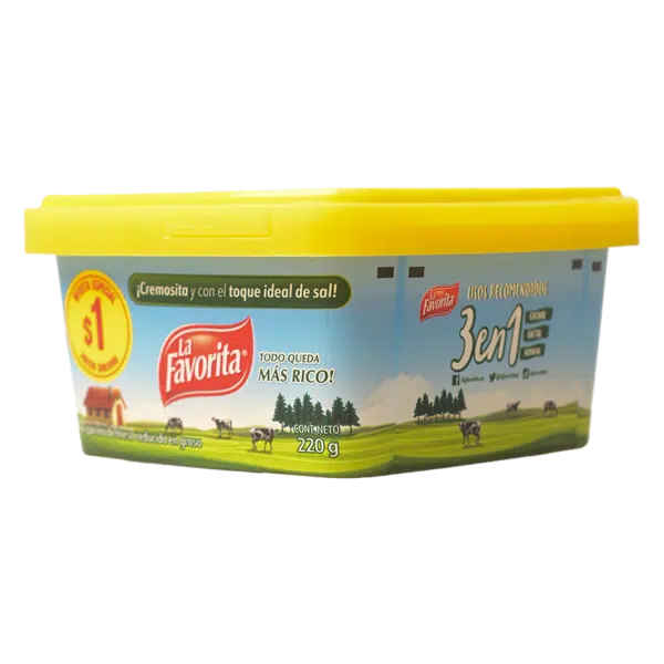 Práctica, ligera y deliciosa. Esta presentación de La Favorita es ideal para hogares pequeños o para llevar contigo. Con su receta reducida en grasa, conserva todo el sabor que te gusta con un aporte más saludable. Perfecta para untar, cocinar o darle un toque especial a tus comidas diarias