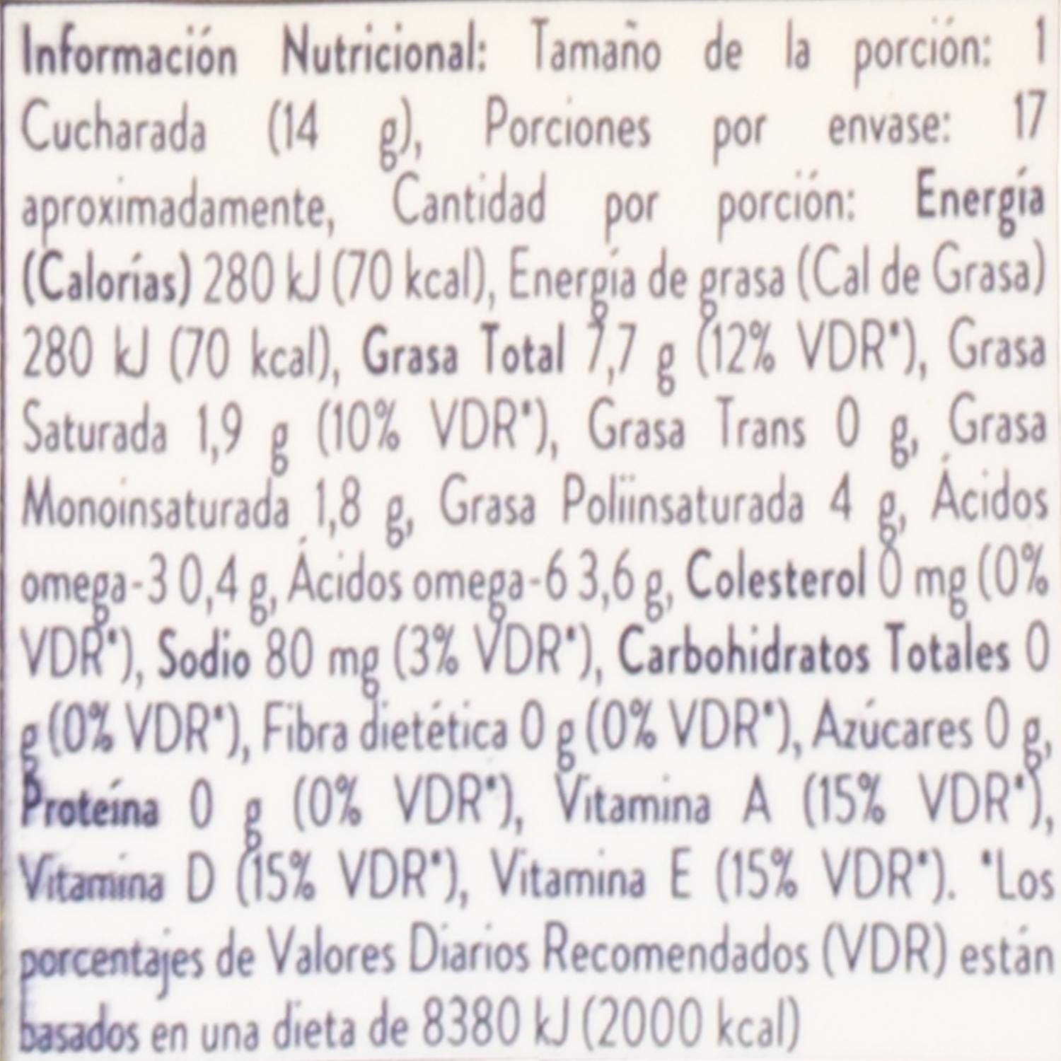 - Ideal para untar, cocinar y para repostería, reducida en grasa con omega 3 y 6. 0% de colesterol