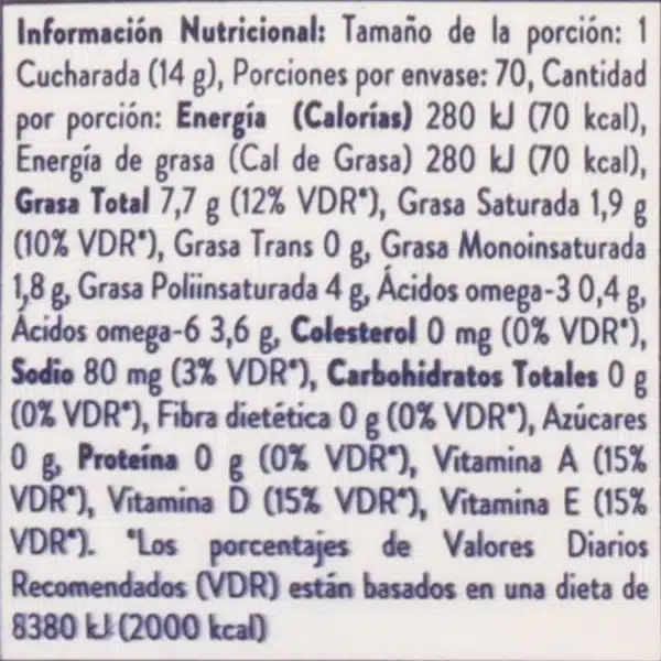 Ideal para untar, cocinar y para repostería, reducida en grasa con omega 3 y 6. 0% de colesterol