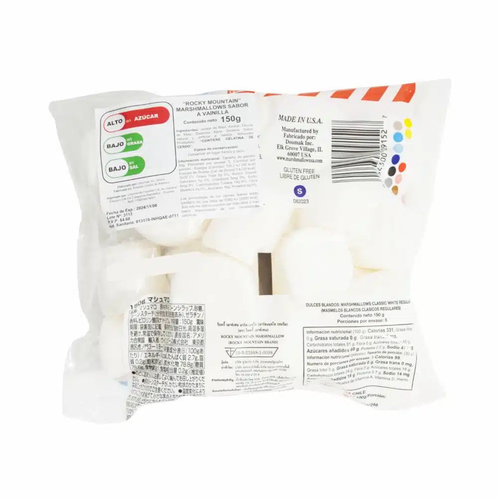 - Textura suave y esponjosa. - Sabor dulce y delicioso. - Ideal para hacer malvaviscos tostados o añadir a bebidas calientes. - Versátil, se puede usar en postres, decoraciones de pasteles, o simplemente disfrutar solos. - Empaque conveniente y fácil de llevar