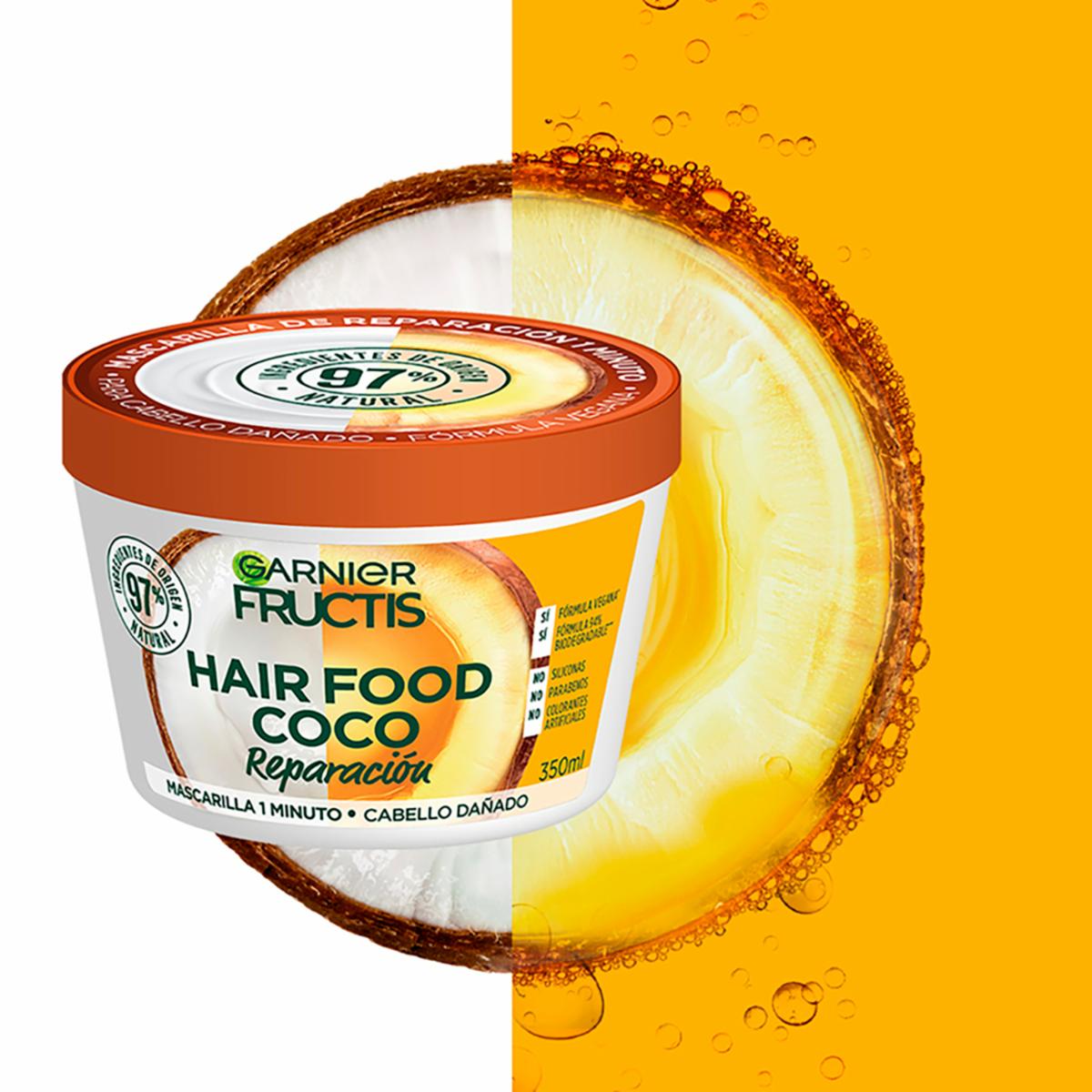 - Mascarilla Garnier Fructis Hair Food Coco 350ml para reparar tu pelo en solo 1 minuto ¡La nueva forma de alimentar tu pelo!
