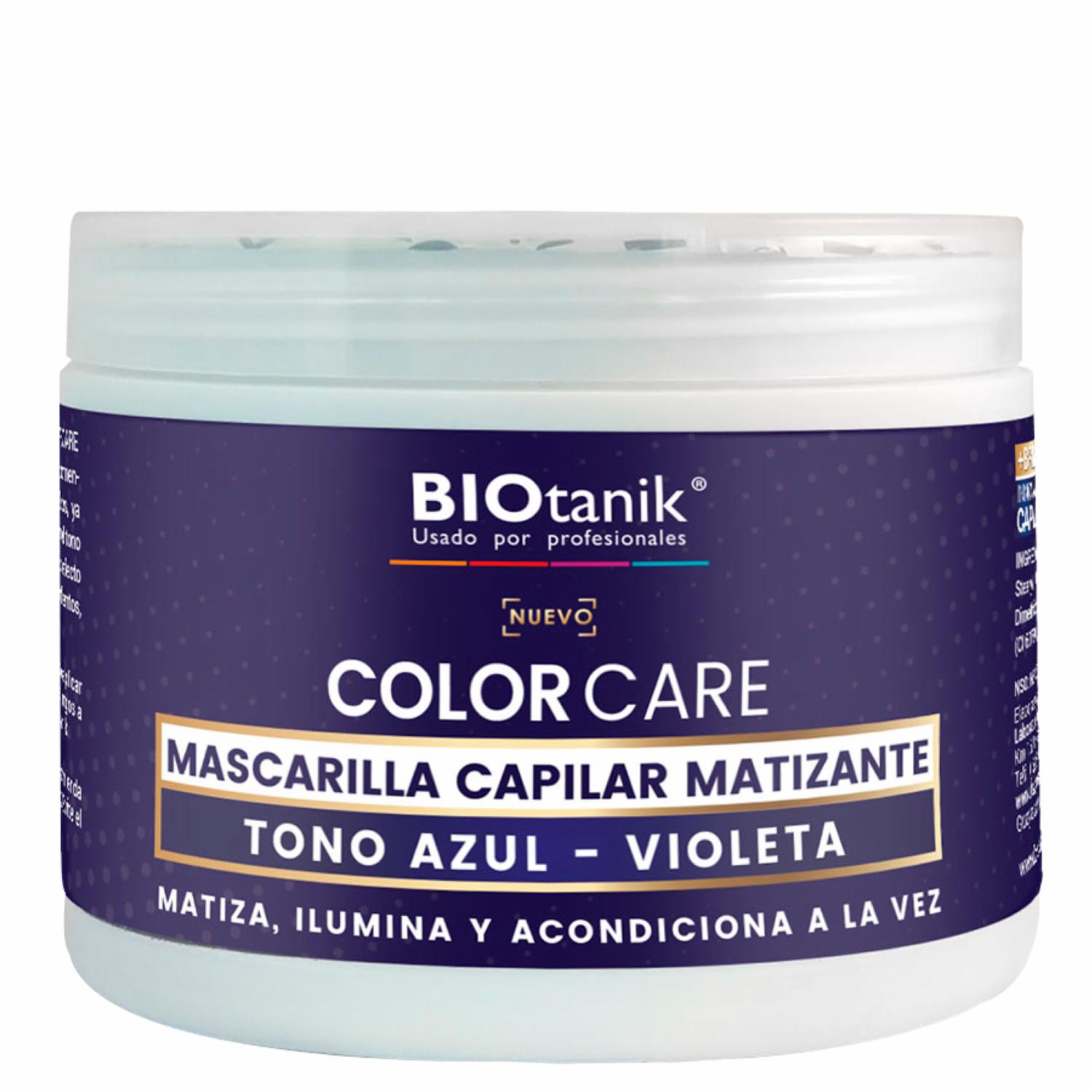 La nueva mascarilla matizante COLORCARE de BIOtanik es una especialidad recomendada para matizar los cabellos rubios, ya que está formulada en tono azul - violeta, el mismo que matiza y ayuda a reavivar el tono del cabello decolorado o naturalmente rubio, cuando éste ha adquirido cierto efecto naranja, cobrizo, verdoso u opaco. Matiza las canas, neutralizando los tonos amarillentos, otorgando humectación y brillo