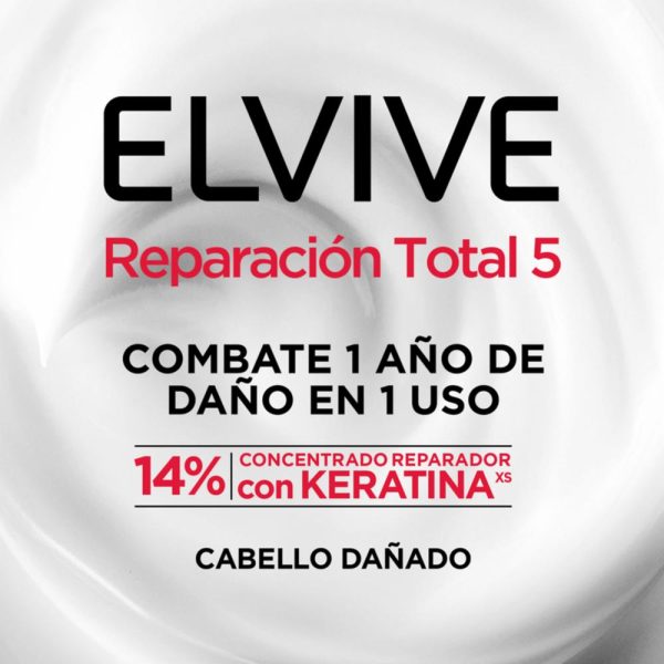 Mascarilla Tratamiento Elvive Reparación Total 5 con 14% de concentrado reparador con Keratina XS y sin sal para cabello dañado. Repara, fortalece y protege la fibra capilar, para transformar el cabello dañado en un cabello sedoso y brillante. -Repara los 5 signos del cabello dañado: Resequedad, Fragilidad, Deshidratación, Aspereza y Puntas Abiertas -Aplicar sobre el cabello lavado y húmedo una cantidad suficiente para cubir de medios a puntas. -Dejar actuar 2-3min y enjuaga5