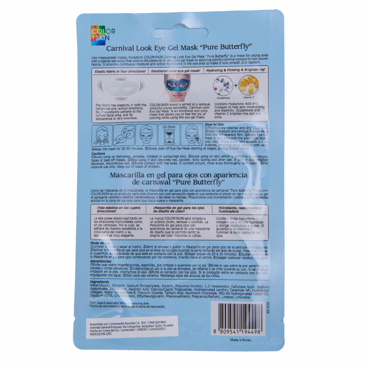 - Características - Mascarilla para contorno de ojos en gel - Diseño Pure Butterfly - Ayuda a disminuir la hinchazón y ojeras - Aporta frescura y suavidad